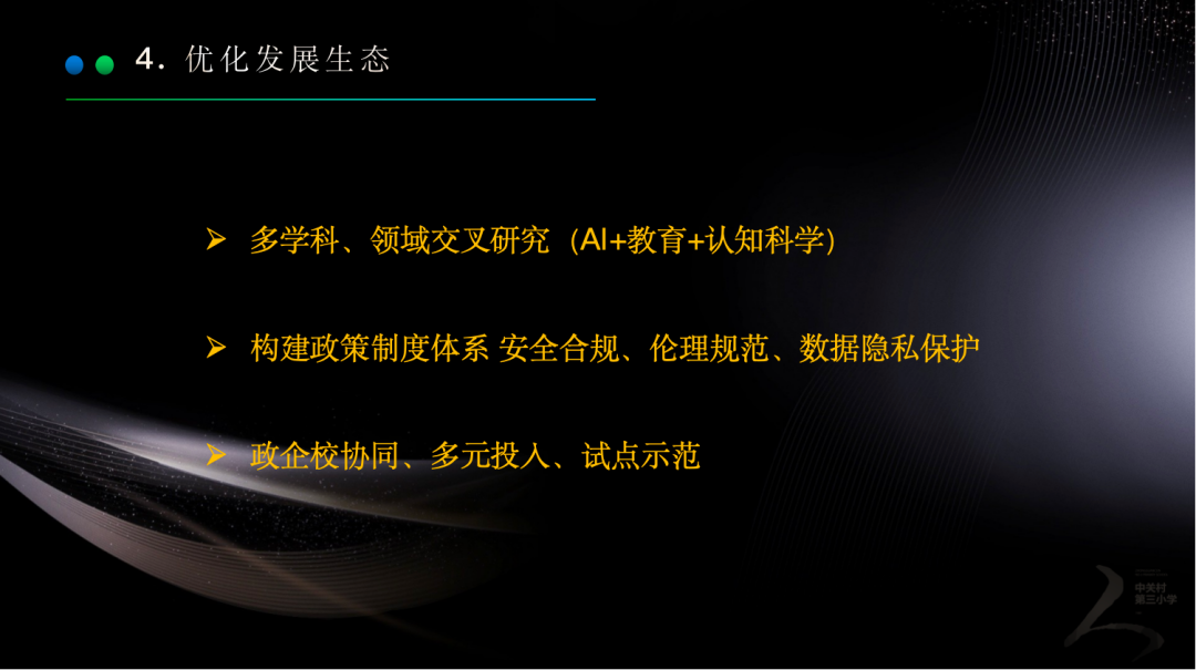 优化生态发展,推动多学科交叉、政策完善、伦理规范、数据安全和政企协同。