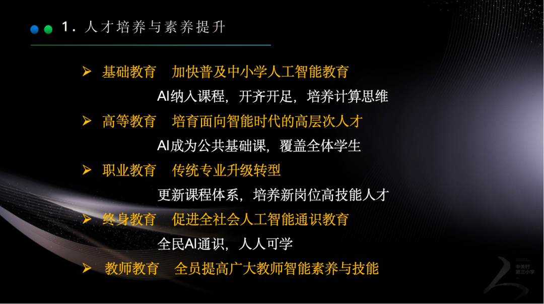人才培养与素养提升,普及中小学人工智能教育、强化教师培训,并通过高等教育培养创新复合型人才;