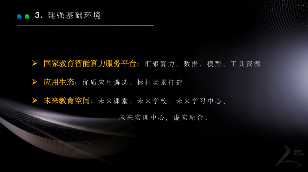 建强基础环境,包括算力、数据、算法、应用生态及未来学习空间建设;
