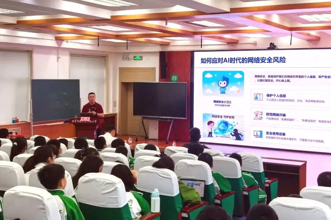 小学场在海淀区翠微小学举行,奇安信集团技术专家康乐带来了以“筑牢数字安全防线 享受AI时代新生活”为主题的AI安全科普讲座。