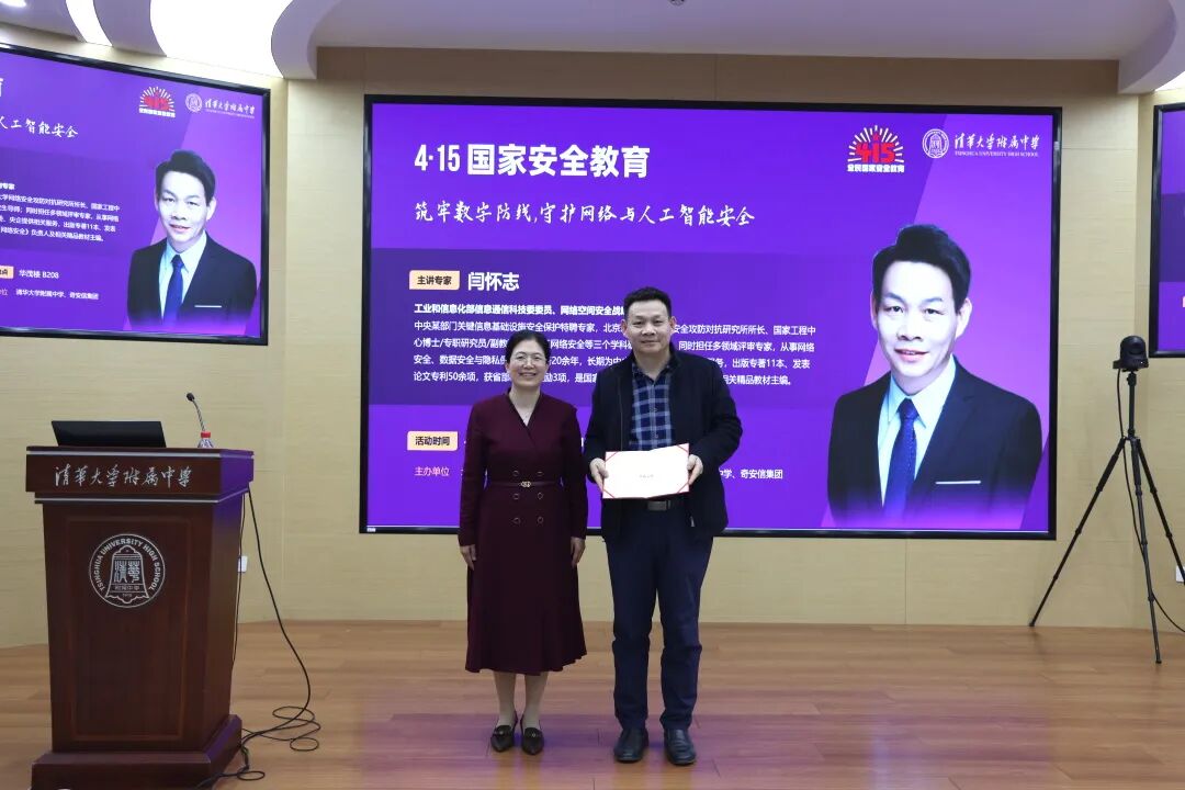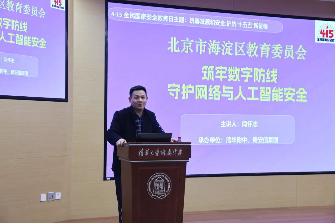 中学场在清华大学附属中学举行,北京理工大学网络安全攻防对抗研究所所长闫怀志带来了以《筑牢数字防线 守护网络与人工智能安全》为题的专题讲座。
