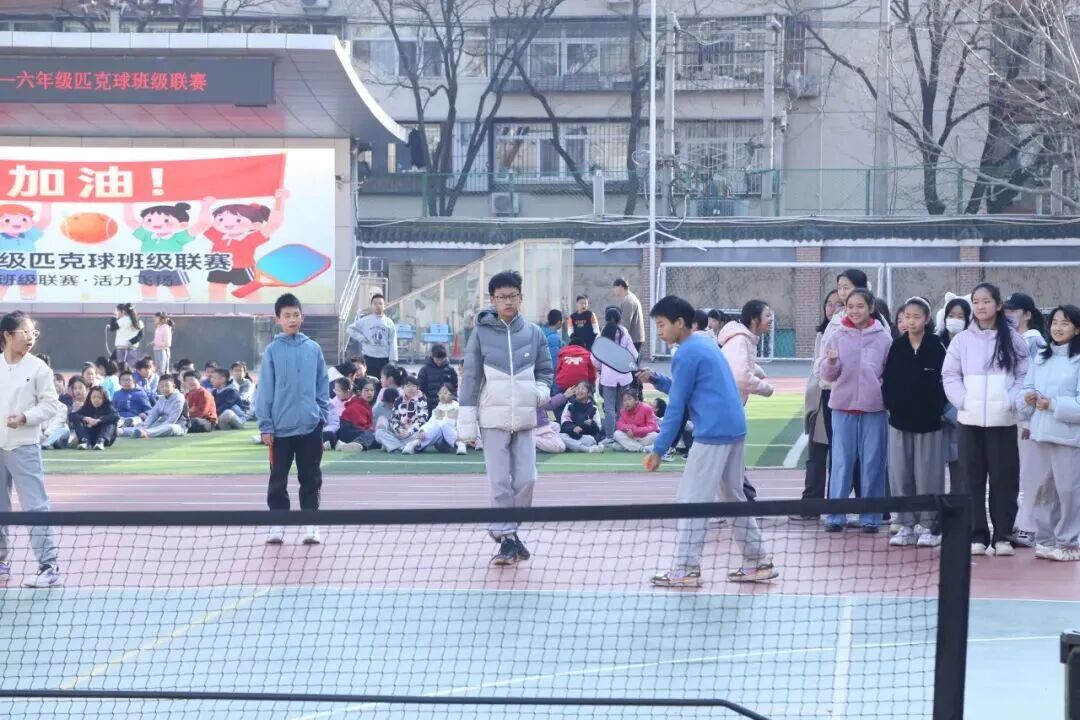 一场为期四周、六年级学生全员参与的“匹克球班级联赛”火热上演。学校通过匹克球这一适龄、有趣的运动载体,让同学们在奔跑中强健体魄,在配合中学会信任,在输赢中锤炼心态。比赛现场,12个班级的同学们轮番登场。球网两侧,选手们时而轻吊网前,时而大力扣杀;小球在球拍间划出优美弧线,每一次精准的回球都引来场边同学的尖叫与掌声。在比赛中,学生们学会了尊重裁判、尊重对手。同时,他们也学会了在落后时不轻言放弃,在领先时不松懈大意,在一次次并肩作战中体会团结协作、永不言弃的体育精神。