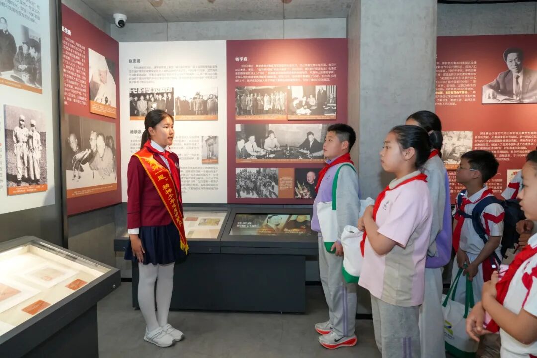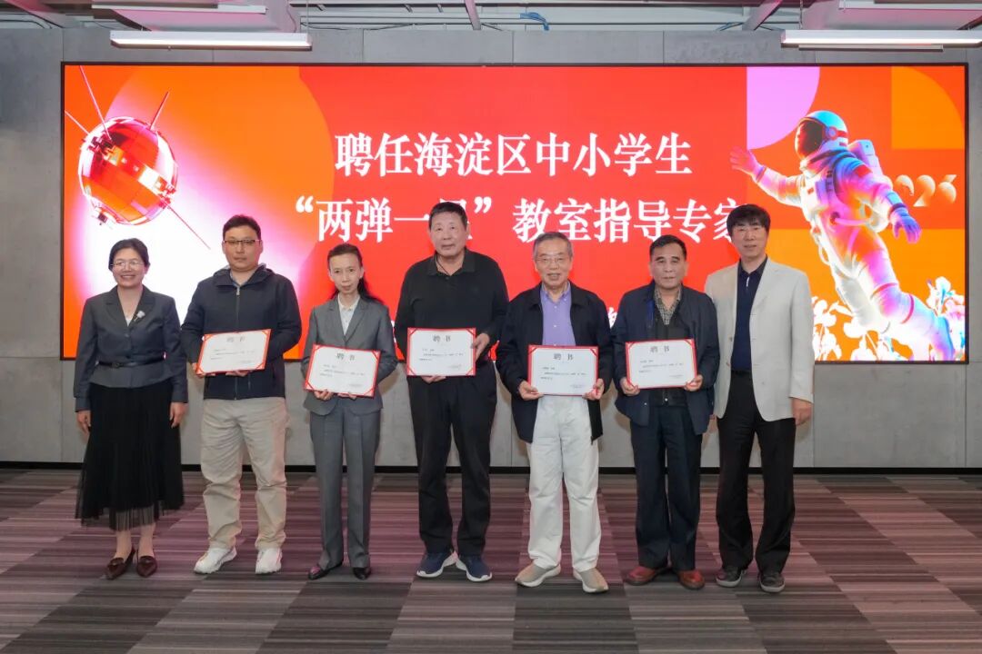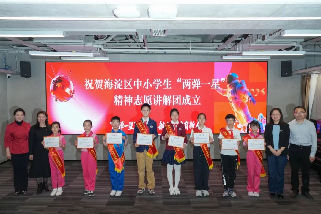 为助力青少年儿童航天科普学习,推动科学教育走深走实,活动现场聘请罗援、彭继超、程之刚、梁旋、胡虓锟为“两弹一星”教室特聘指导专家,并宣布成立海淀区中小学生“两弹一星”精神志愿讲解团。八位队员代表上台领取证书,成为“两弹一星”精神的小小传承人。