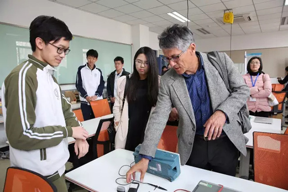 会议结束后,与会的教师参观了清华附中自动化与机器人、能源系统、地理信息、计算机科学等4个高研实验室,并与高研实验室的学生(其中还包括生命科学实验室和化学分析实验室)交流他们的项目。老师们对学生的项目给予了极高的评价。戴维·查维斯评点说,学生完成这样的项目要学习各领域非常多的知识,并结合各种技能,以及跨学科的学科应用和创新能力,这是非常了不起的。