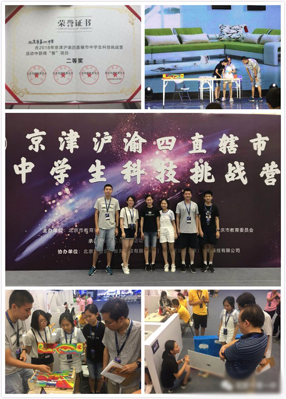 2018年8月2日至6日,由北京市、天津市、上海市、重庆市四市教委共同主办的京津沪渝四直辖市中学生科技挑战营活动在北京大学附属中学举办 ,来自四直辖市的73支参赛队近400名师生共同参加此活动,这也是四直辖市科技教育领域的首次联合联动。本次挑战赛的两个项目分别是“智”和“造”。“智”项目中,同学们需要通过舞台表演的形式,将人机互动、科技与文化融为一体,巧妙的融入地域特色或学校文化,完美地诠释科技与文化共荣的主题。“造”项目则是运用机械结构与电脑编程解决“汉诺塔”的问题。