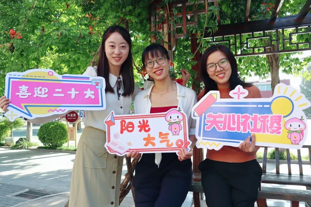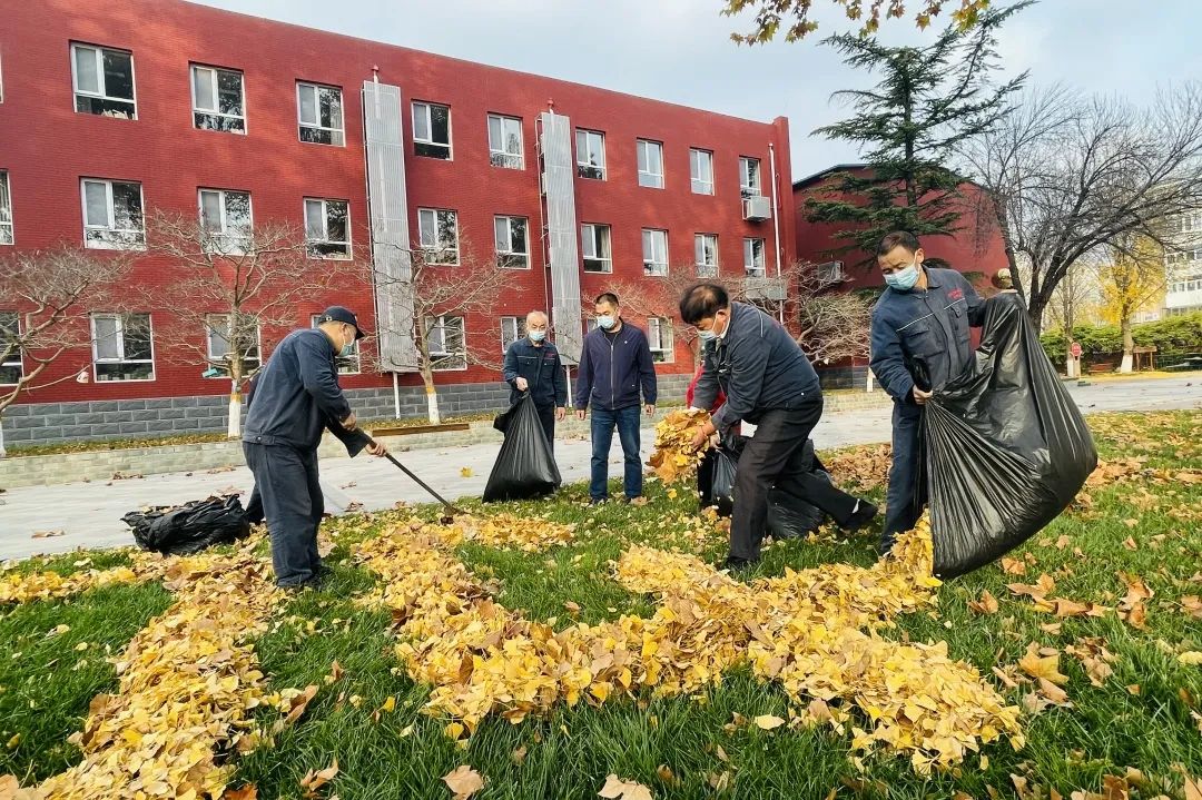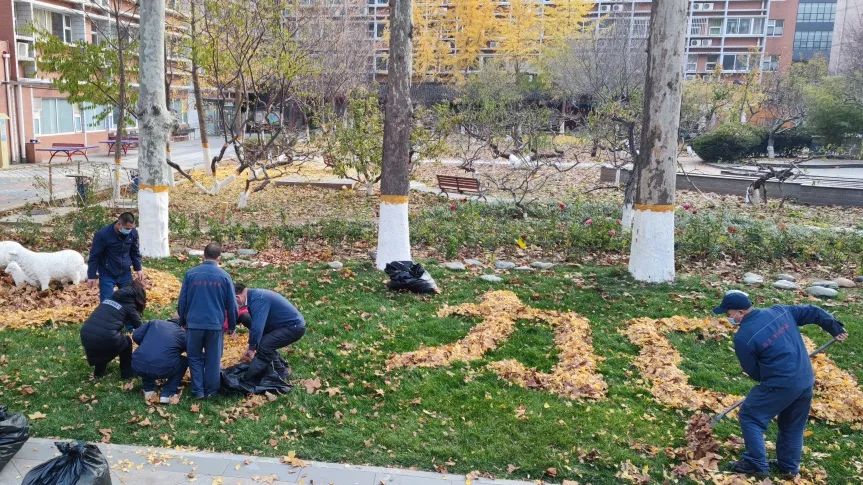”虽说落叶是无情的,但学校行政后勤党支部通过加入创意,让叶子融入感情和温度。于是我们找了校园中一个相对空旷的地方用落叶拼字,因为当时学校高三的孩子在楼上上课,我们还稍微拼得大一些,让他们可以清楚地看到。”