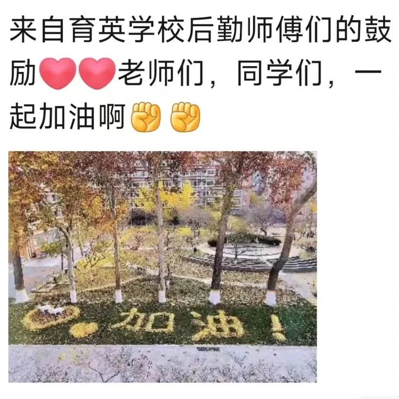 有了老师们的辅导和鼓励,学生们的线上学习有精神头儿,而在线下,校园里的行政后勤工作人员也在用自己的方式给同学们鼓劲加油。育英学校被誉为“京城最美校园”,深秋初冬也是校园里最美的时节,怎样让居家的孩子们看到校园的美景,师傅们用即将废弃的“落叶”做起了文章。