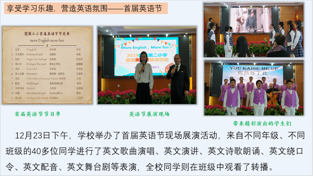 航天图强小学从2019年起至今,连续举办四届校园英语文化艺术节活动(简称英语节)。英语节的举办对学校英语团队有多方面的积极影响,它不仅为学生提供了应用语言、提升素养的平台;也提升了学校英语团队的凝聚力和创造力;历届英语节的成功举办,扩大了英语学科的辐射效应,增强了家校沟通与学科融合的效果;也使学校拥有了良好的英语学习环境和文化氛围。