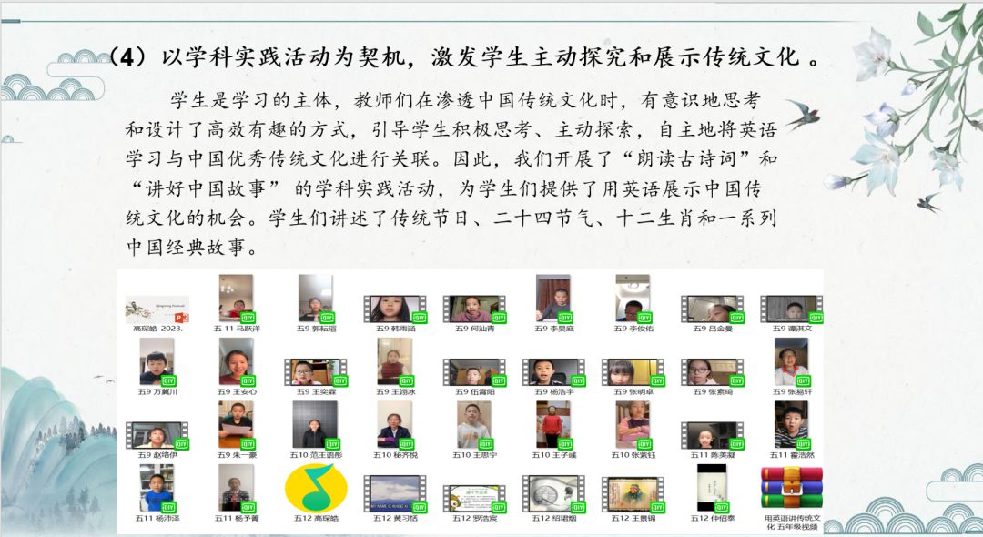 在英语实践活动和课程开发中,将传统文化教育作为综合实践活动或课程的主题和目标,对学生文化素养建设和美育培养都有着深远的教育意义。这次主题交流活动将助力各校教研组,进一步完善已有活动设计和课程开发,积极转化活动和课程成果,切实提升学校五育并举实效。
