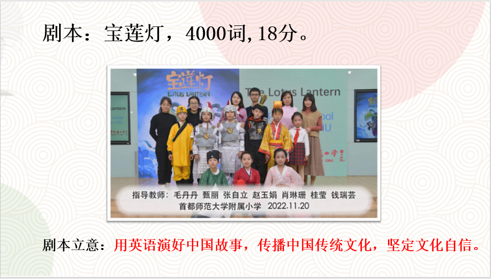 首师附小柳明校区英语教研组分享了小学英语教学中渗透传统文化的实践研究的课题案例。老师们结合文献研究和教学实例,探究如何在小学高年级英语课堂渗透中国传统文化,以发展学生跨文化沟通和交流与交流的能力,同时帮助他们加深对中华文化的理解和认同,坚定文化自信。随后,柳明校区的老师们还同大家分享了他们在学校英语戏剧课程中的探索,并展示了学校自主编排的英语戏剧《宝莲灯》。