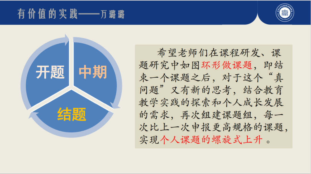 在各组分享后,万璐璐老师针对几个课题与课程案例进行点评,并予以指导和建议。万老师肯定了各组老师们在综合实践活动及课程方面的探索和研究,并结合自身科研经历,为大家带来了题为《有价值的实践》的讲座培训。讲座围绕教师对综合实践活动课程资源研究的再利用等话题展开,鼓励和指引老师们思考探索:如何在课题研究和课程开发实践中,获得更多的价值和成功。