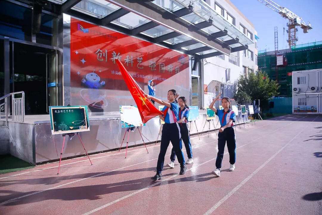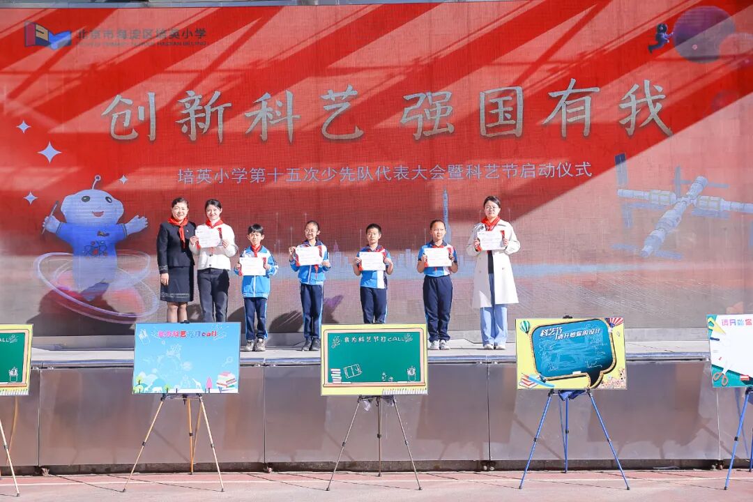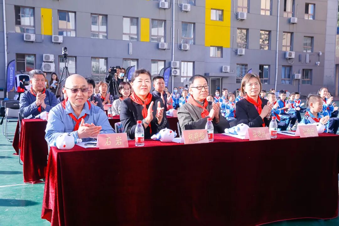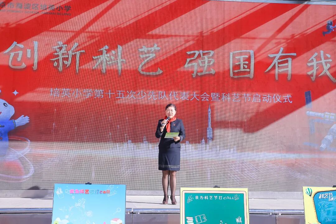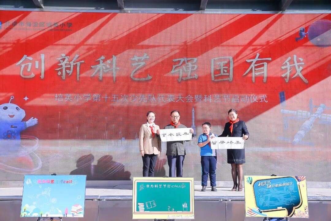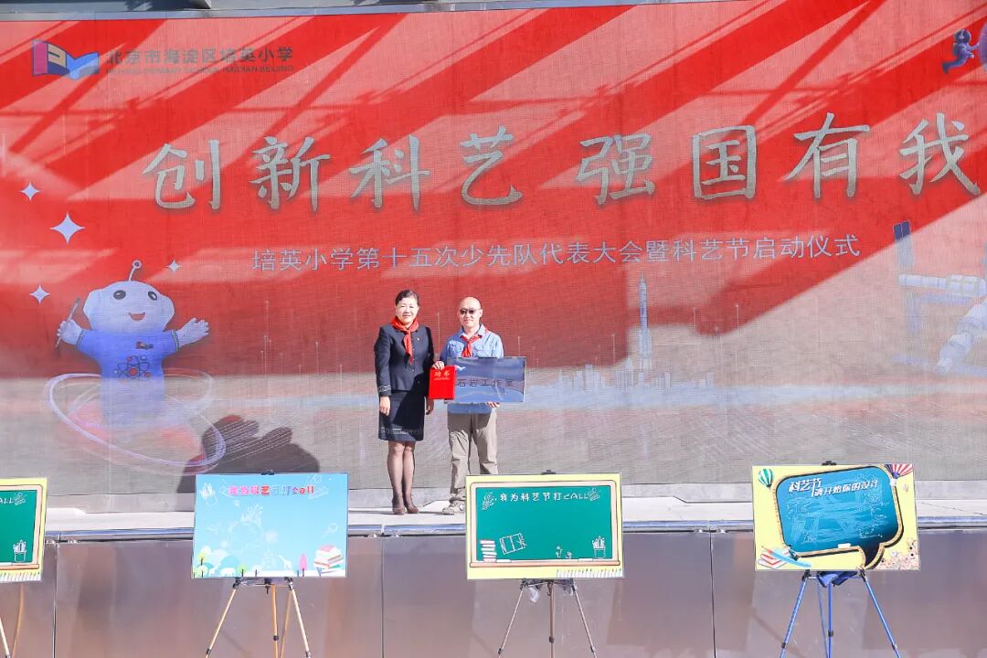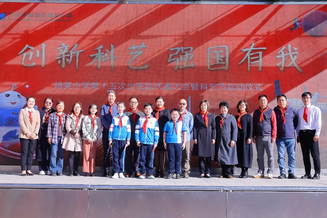 2023年10月9日上午,迎着初秋的朝阳,培英小学在学校操场举行了中国少年先锋队北京市海淀区培英小学第十五次代表大会开幕式暨2023年“创新科艺 强国有我”科艺节启动仪式。培英小学杰出校友、区级非遗传承人、基尼斯纪录创造者,张晓林;北京工业大学艺术设计学院副教授、硕士生导师,民盟北京工业大学委员会副主委,石岩;民盟中央教育委员会委员、民盟北京市委教育发展研究委员会副主任,张姗姗;培英小学党总支书记、校长祝莉娟参加了活动。