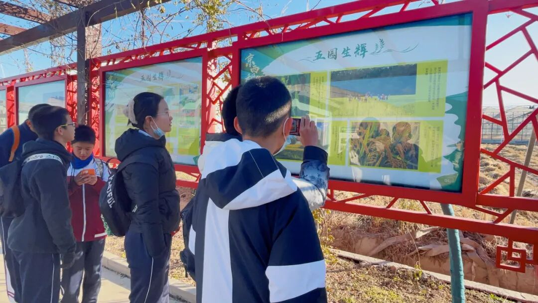 活动伊始,农庄负责人吕老师带领大家走入农耕文化长廊,以图文结合的方式,带领大家从男耕女织的传统农业走向智能精细的现代化科技农业,并对京西稻及杂交水稻之父袁隆平进行了详细解说,为同学们介绍了紫白菜、宝塔菜花、彩色花椰菜等农庄的特有蔬菜。