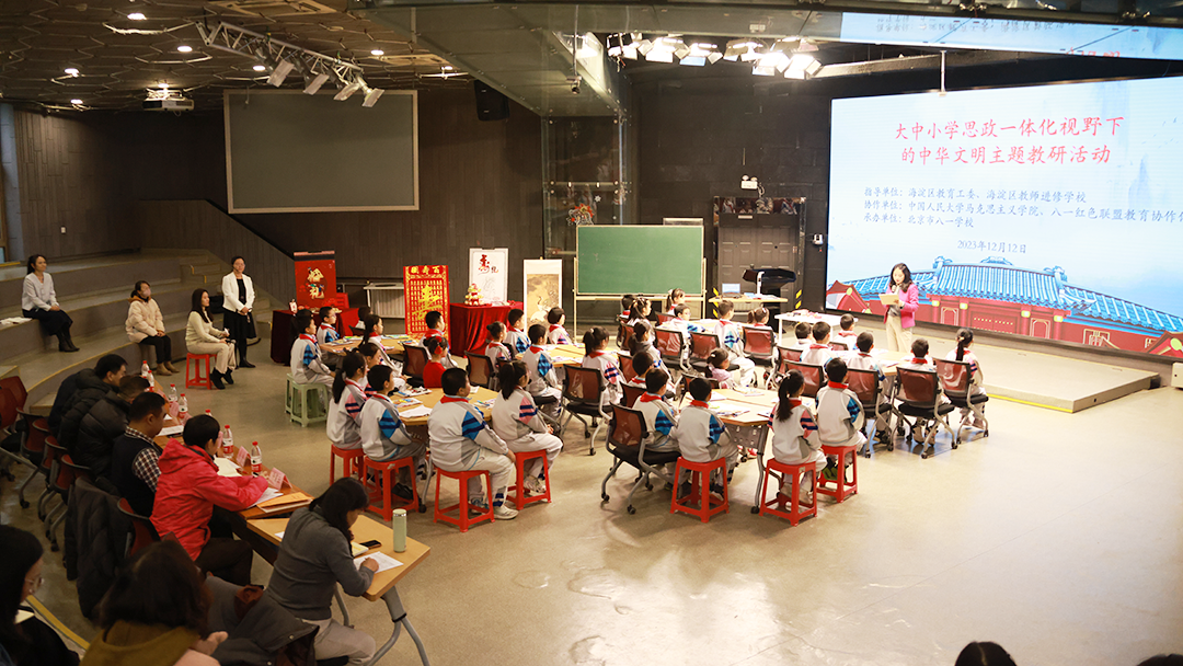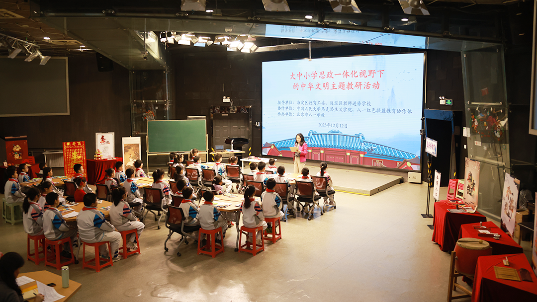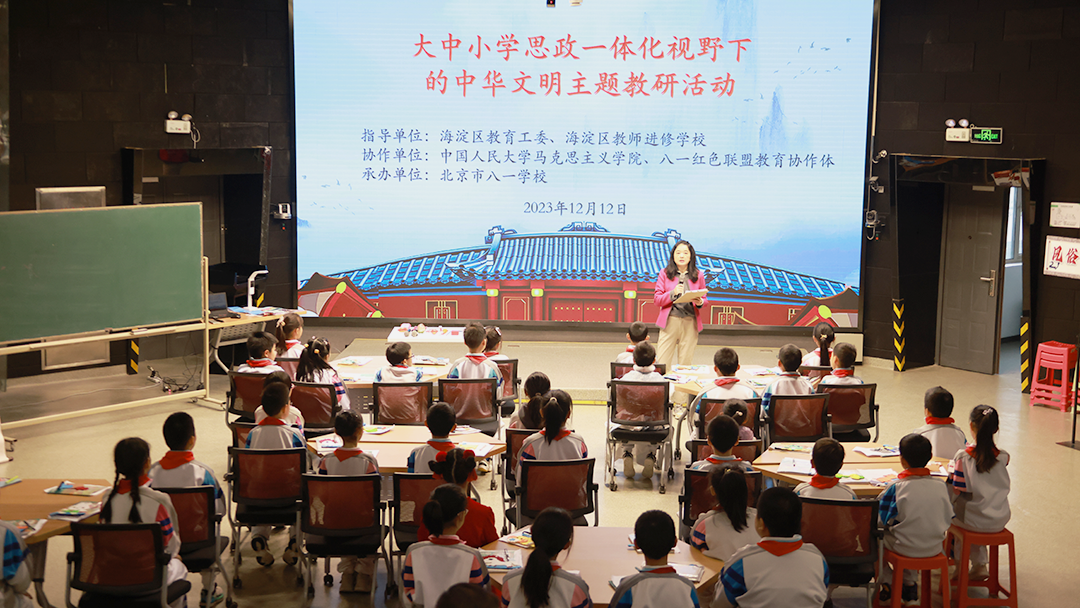循大道,至万里。基于对大中小思政一体化建设发展现状中存在问题的判断,针对中华文明中优秀传统文化继承与创新对中国式现代化建设的民族意义,从新时代新征程端详中华文明,从中华文明的历史坐标观察中国式现代化。2023年12月12日,八一学校举办“纵古贯今、欣欣家国——大中小思政一体化视野下的中华文明”主题教研活动,进而呈现如何在一线课堂与教研中,牢牢把握“中华文明”这一重要内容,深入研究,在青少年学生思想政治教育过程中,始终围绕“培养什么人,为谁培养人,如何培养人”这一根本问题,全面落实有理想、有本领、有担当的时代新人培养要求。活动由初中道法教研组长余娟老师主持。