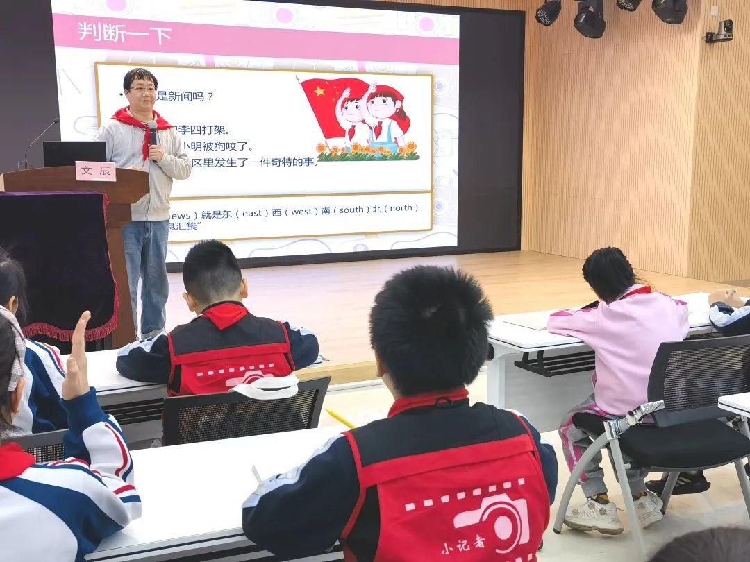 授课中,文辰老师为小记者们讲解了记者及新闻的相关知识,以新闻故事为切入点,利用生动活泼的语言描述故事情节,从新闻的定义、新闻的真实性、实效性和简明扼要性展开讲解;并向小记者介绍了新闻的要素、记者的分类和基本素质以及采访的要求,着重强调小记者最重要的不仅是要报道事实还要观点明晰、导向正确;对小记者从写作到素材整理、编辑成稿等各方面进行详细梳理和引导。小记者们认真倾听、随时记录,并踊跃互动。通过培训,大家了解了记者的采访过程,学习了采访方法,懂得了什么是新闻,并学会了如何写一篇报道等等。一堂讲座下来,小记者们都摩拳擦掌、跃跃欲试,对今后在实践活动中履行小记者职责充满信心和期望。