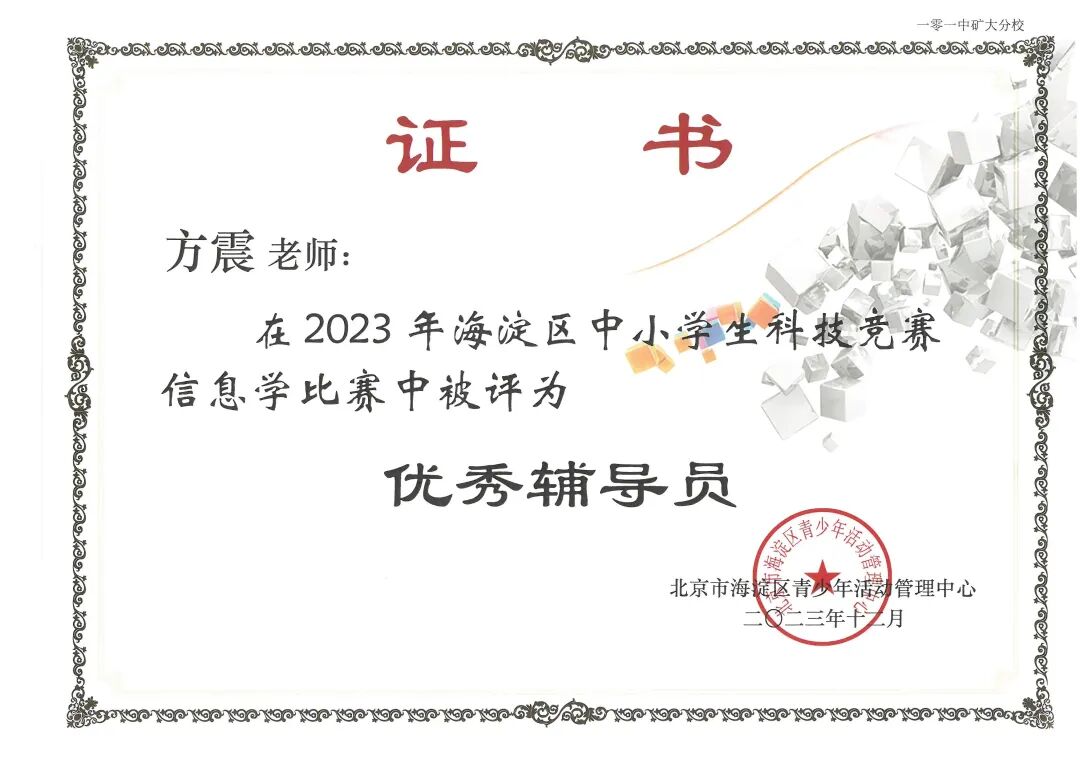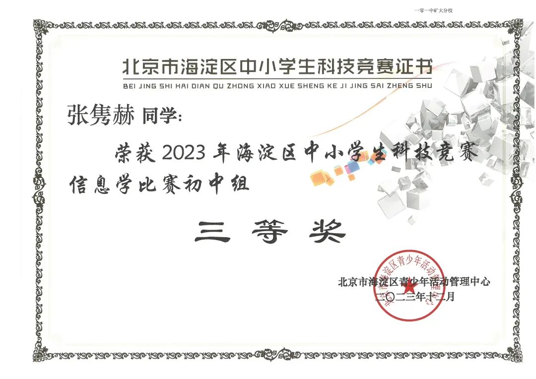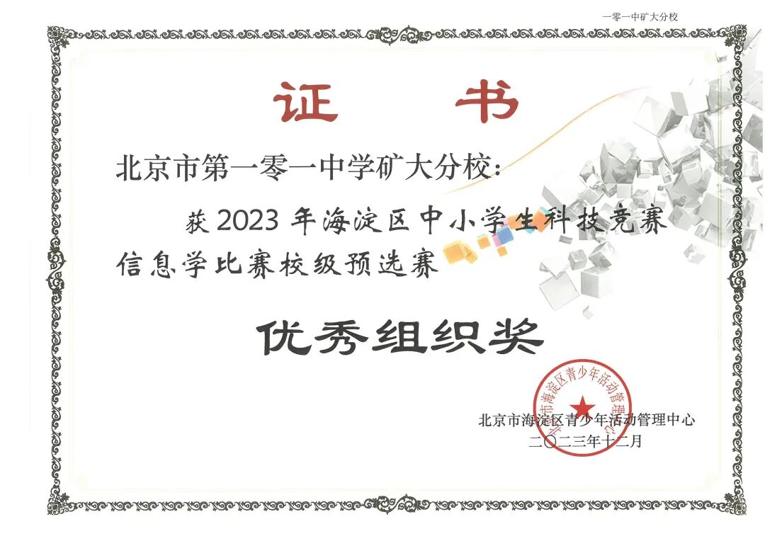 由海淀区教委主办,海淀区青少年活动管理中心承办的海淀区中小学生信息学竞赛,原名“海淀区中小学生信息学奥林匹克竞赛”,是旨在向全区中小学生普及信息学知识的竞赛。本赛事已有20余年历史,为海淀区培养了大批高素质信息学人才。经过3轮赛事的激烈角逐,北京一零一中矿大分校5位同学获奖,其中黄梓豪同学获得一等奖,张隽赫、毛建皓、刘尧,王劭茗同学分别获得三等奖,方震老师被授予优秀辅导员奖,北京一零一中矿大分校被授予优秀组织奖。