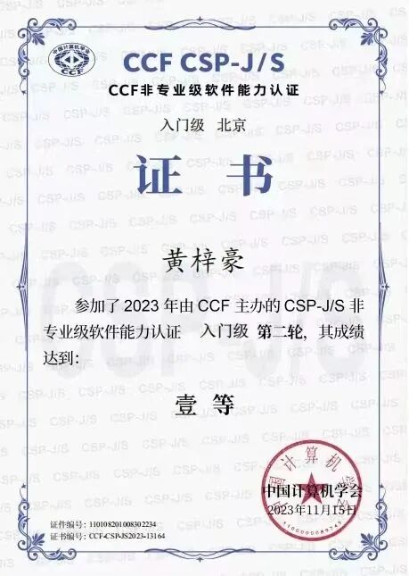 CSP-J/S:CCF非专业级软件能力认证(Certified Software Professional Junior/Senior,简称 CSP-J/S)。该项认证重点考察软件开发者实际编程能力,由中国计算机学会统一命题、统一评测,委托各地设立的考试机构进行认证考试。北京一零一中矿大分校初二(5)班黄梓豪同学荣获CCF非专业级软件能力认证入门级一等奖。