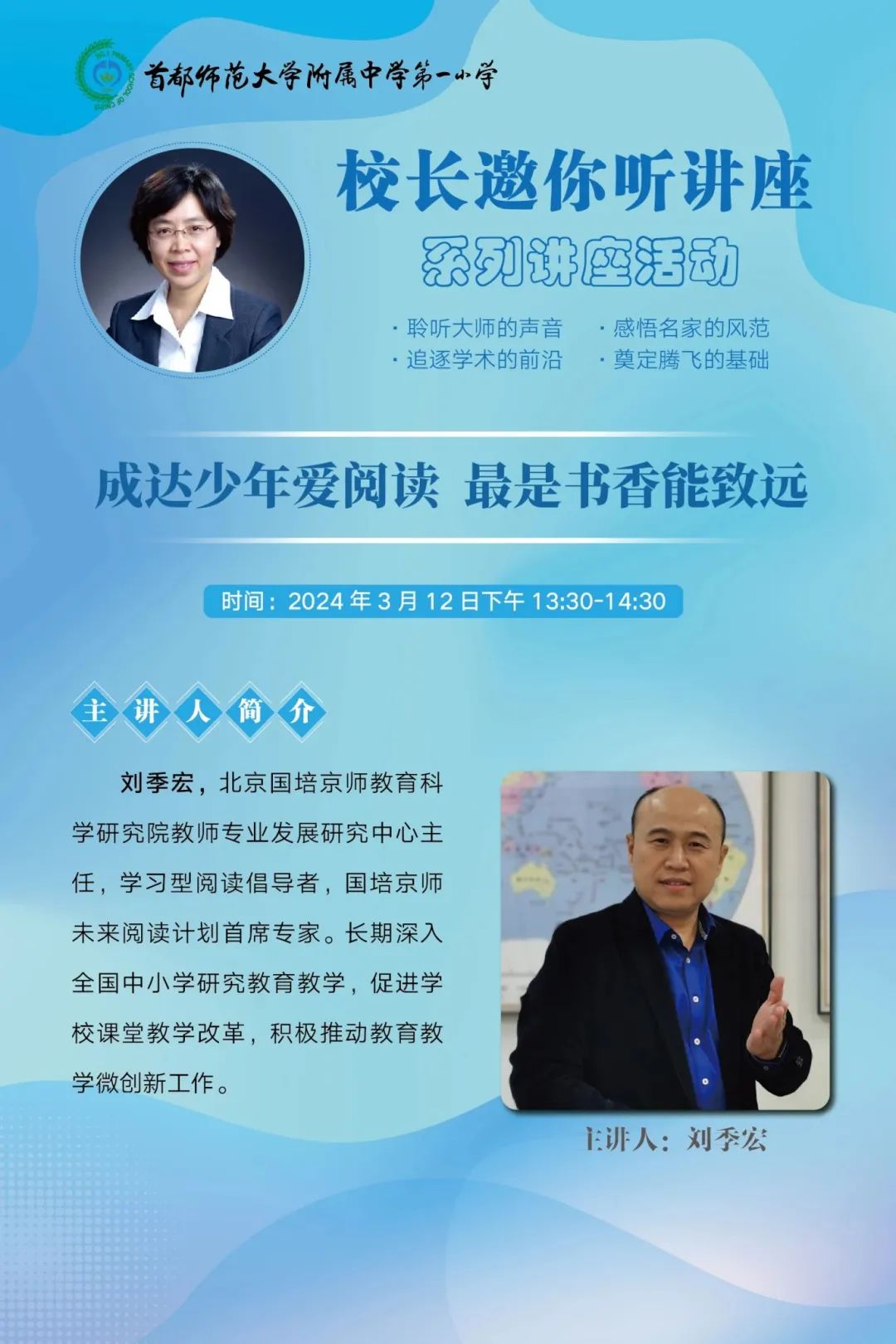 加入首师大附中教育集团以来,首都师范大学附属中学第一小学全方位对接集团优质教育资源,将首都师大附中坚持12年开展的“校长邀你听讲座”课程因地制宜地延伸到小学段,在全面落实成达教育,落地小、初、高一体化育人模式方面持续精进。