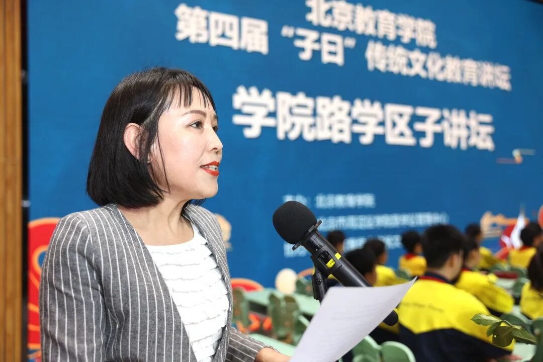 海淀区学院路学区管理中心副主任杨蕾在讲坛上做了《传统文化润童心 培根铸魂育新人》的精彩报告。