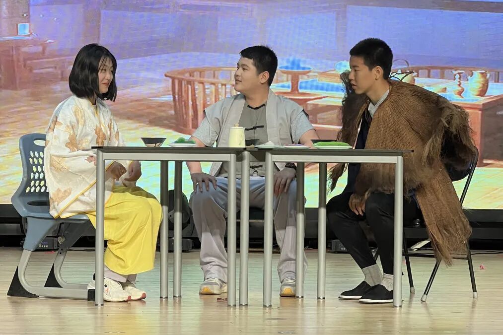 在学校礼堂内,初二(4)班的同学们正在演绎“芳草鲜美、落英缤纷”的桃花源,陶渊明为无数文人骚客描绘的理想圣境出现在舞台上,带来一场“怡然自得”的视听感受。