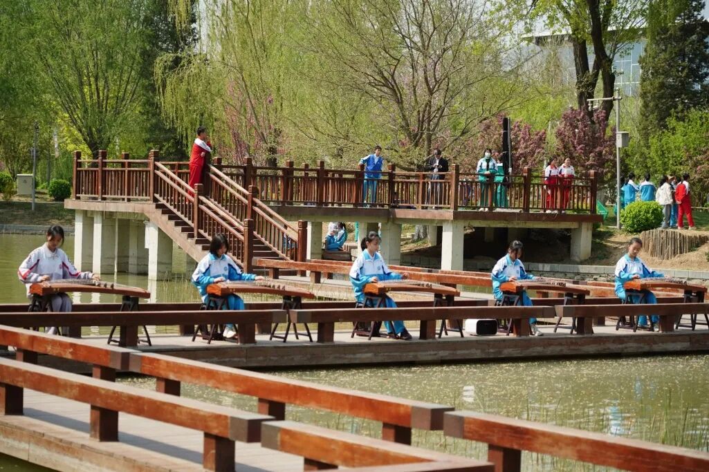 招凉榭旁传来典雅悠扬的琴音,古筝社团的同学们正在倾情演绎,流传千年的悠扬旋律,时而温婉缠绵,时而激越高亢,桃花与古筝,现实与历史,带来一场跨越时空的对话。