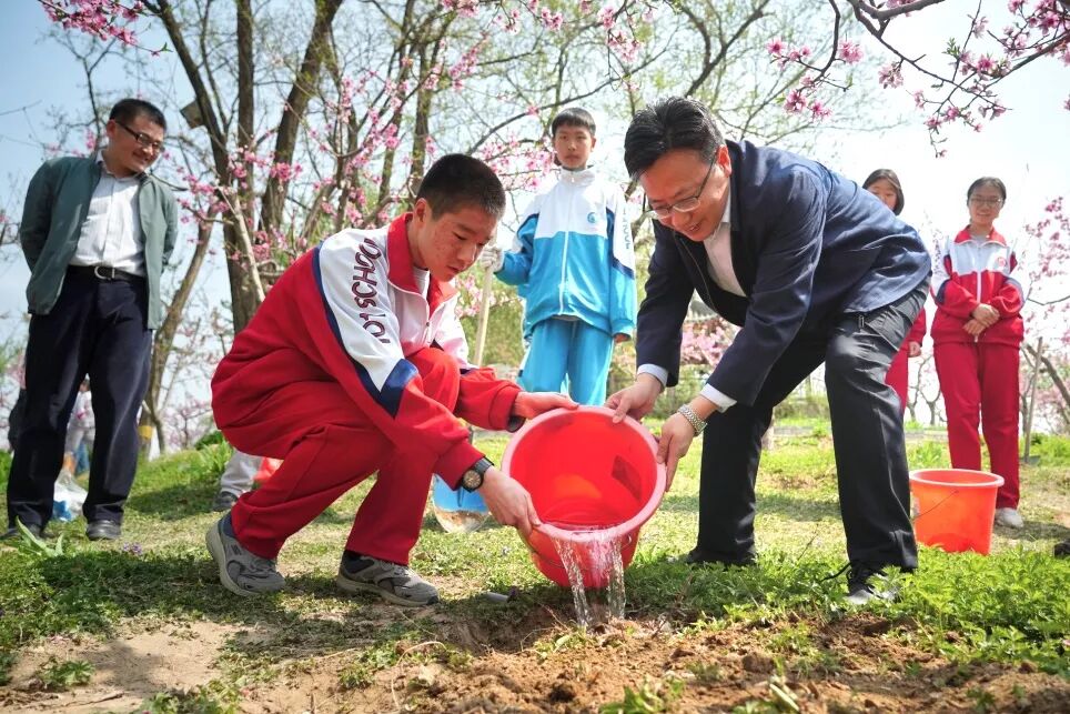 这不仅是一场节日的庆典,更是一节生态教育的实践课,在熊校长的带领下师生们一起为桃树施肥,共同用实际行动践行“生态智慧”教育,建设一零一大美校园。