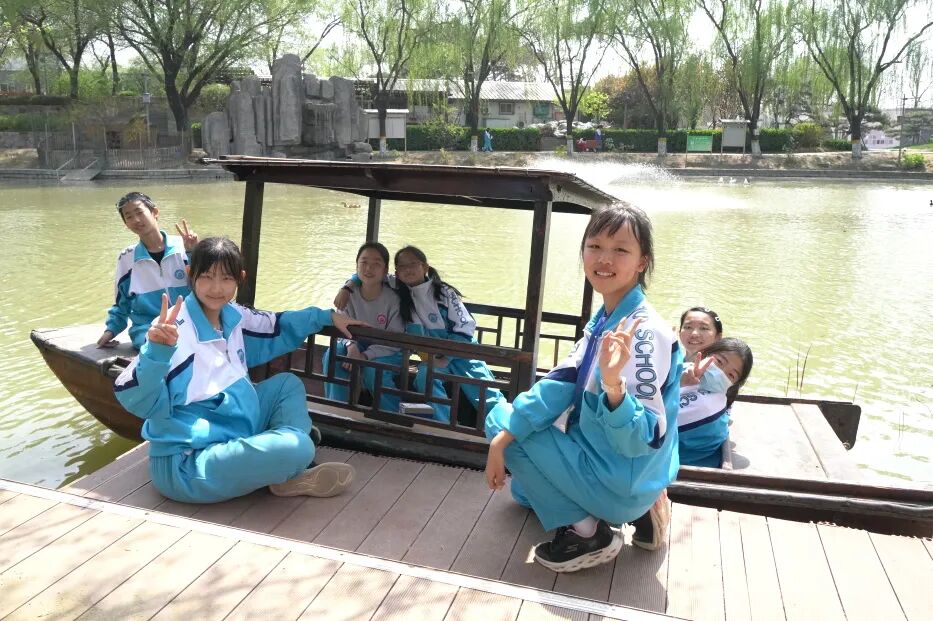 湖畔桃花盛开,同学们泛舟于碧波之上,仿佛置身于梦幻般的桃花源中,任由春风轻拂脸颊,聆听桨声与水波的交响乐章。
