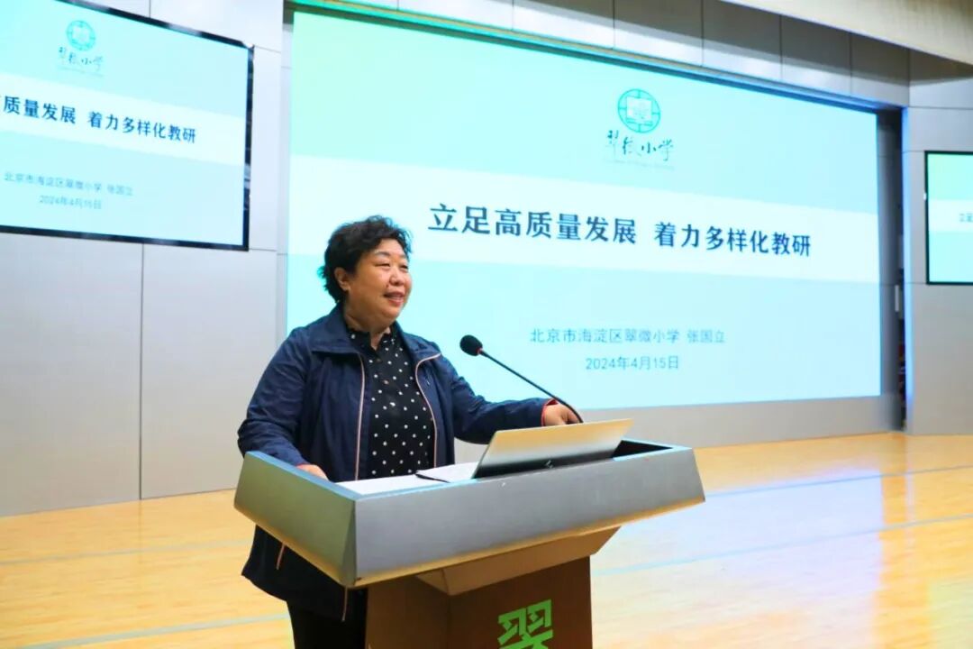 张国立校长以《立足高质量发展,着力多样化教研》为题作报告。报告阐述了翠微小学集团校教研组教研、课题组教研、项目组教研三种教研模型的构建,用“静悄悄的革命”、“局部歼灭战”、“深入持久战”形象地诠释了三种教研模型的特质,且彼此呼应,互为支撑的关系。通过线上和线下、校区与校区、年级和跨年级方式融合,从而实现教学研究的全覆盖,全过程,让不同学科、不同层次、不同想法的老师都能不同程度的参与进来,感受研究的乐趣,体验成长的价值,担当好育人的使命。