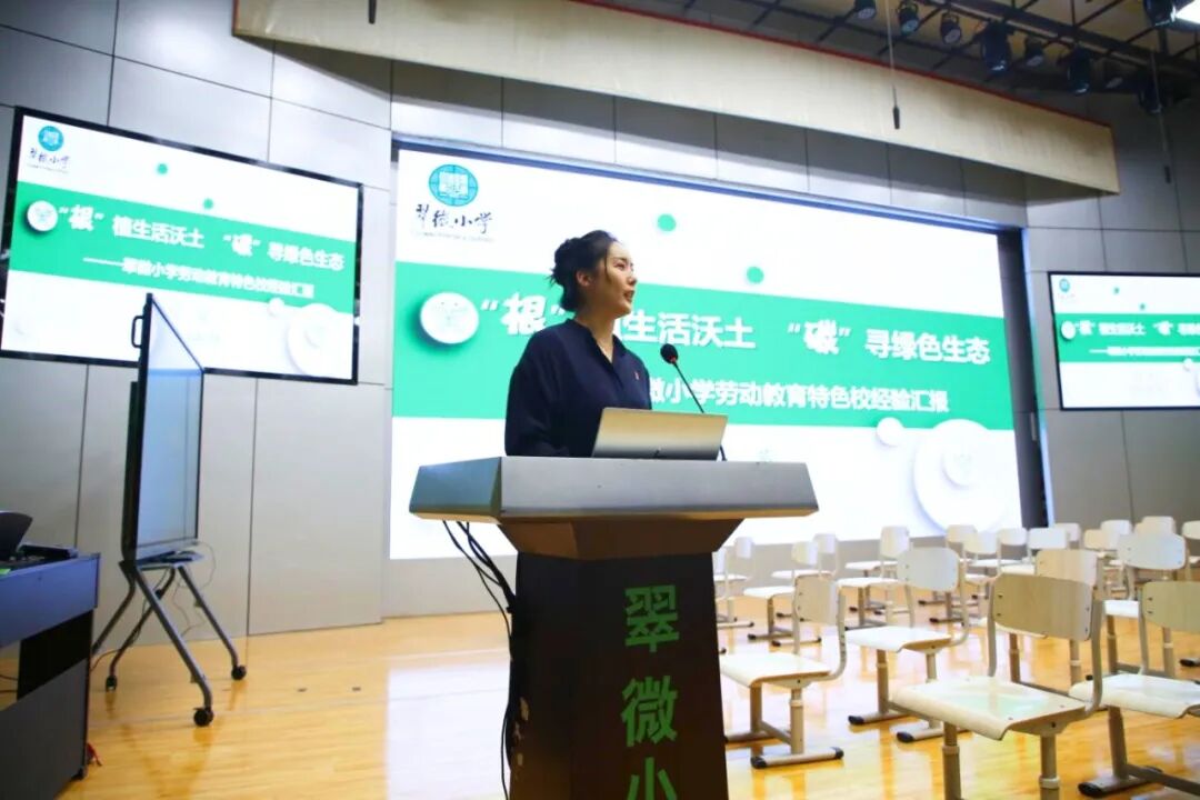 大队辅导员刘茜主任结合翠微小学劳动教育作题为《“根”植生活沃土,“碳”寻绿色生态》的主题分享。重点从学校劳动教育体系建设和学校劳动教育具体实践两方面进行介绍。翠微小学劳动课程在国家课程的实施建设中聚焦课标,梳理十大任务群,进行一至六年级梯度课程的设计和实施。课程和活动的有机融合使得学校劳动教育形成了有深度,有融合,有探究和延伸的沉浸式体验学习。