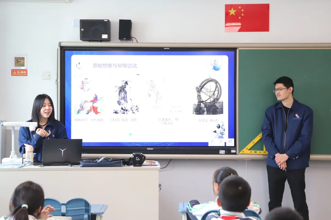 “探索浩瀚宇宙,发展航天事业,建设航天强国,是我们不懈追求的航天梦。”吴栋、张帆老师带领同学们回顾了祖国航天事业发展史,认识了火箭、导弹、飞船等航天重器。