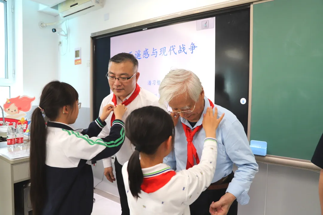 少先队员们为专家佩戴红领巾,飘扬的红领巾表达了玉泉学子对科技工作者的崇高敬意。