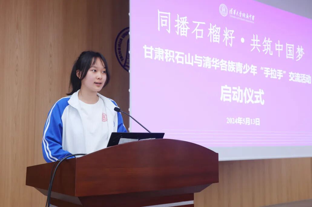 甘肃积石山县民族中学高一9班马进梅同学和清华附中高一12班靳开然同学分别作为两地学生代表发言。她们表达了参加此次活动的激动之情,并希望彼此携手一起度过难忘的清华之旅,为以中国式现代化全面推进中华民族伟大复兴贡献青春力量。