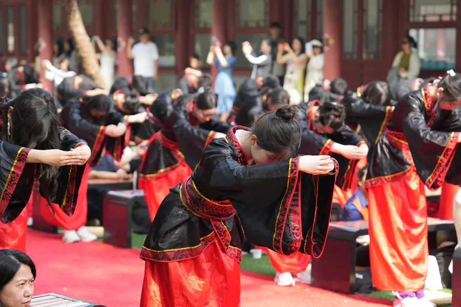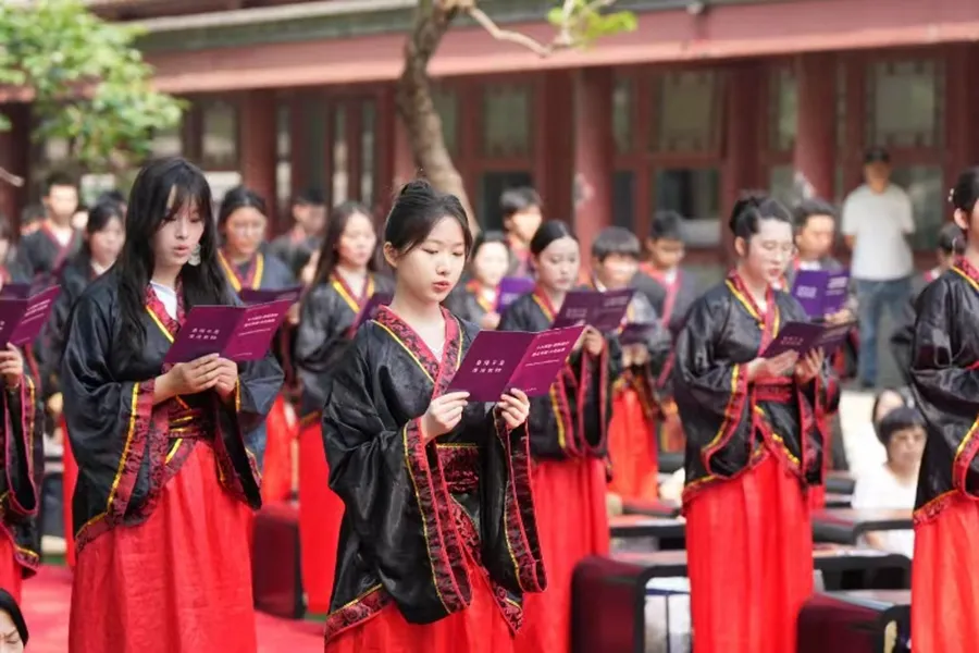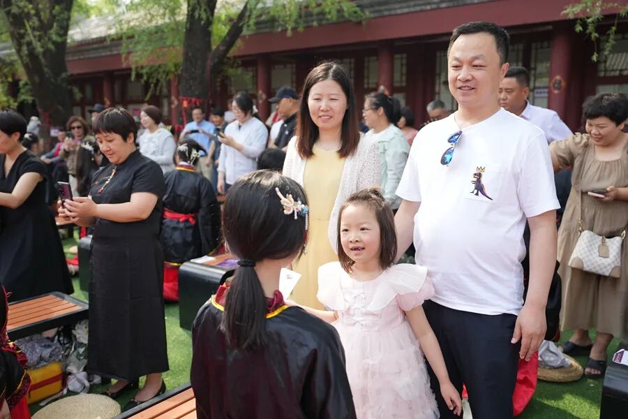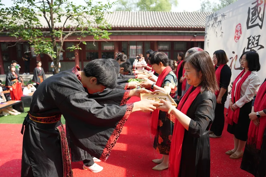 在司仪的主持下,清华永丰高三年级的父母们为男生带帽行“冠”礼,女生头发挽成结,插上簪子行“笄”礼,同学们向父母行跪拜之礼以示尊敬和感谢,在庄重的仪式感中感念父母之恩,感受成长的责任。