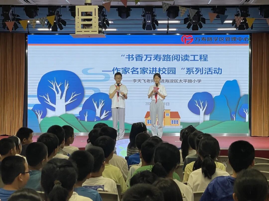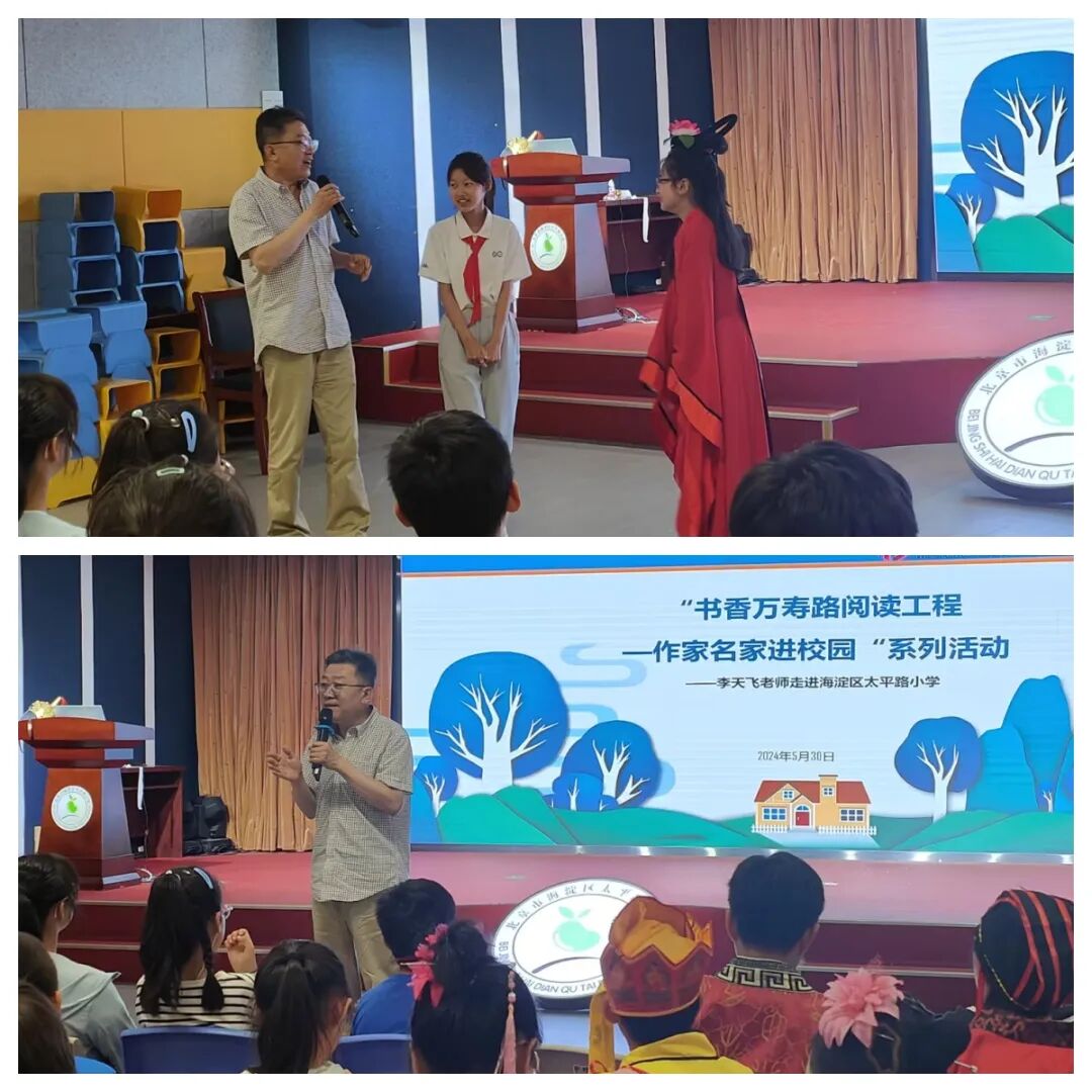 5月30日下午,“书香万寿路阅读工程——作家、名家进校园”系列活动在海淀区太平路小学开展。结合学校语文节中五年级“走进古典四大名著”主题,此次特别邀请了著名儿童作家李天飞老师,与师生们分享古典四大名著的故事、阅读的魅力与写作的奥秘。万寿路学区左卫东副主任亲临指导,给予了本次活动极大的支持和鼓励,五年级全体师生参加了此次活动。