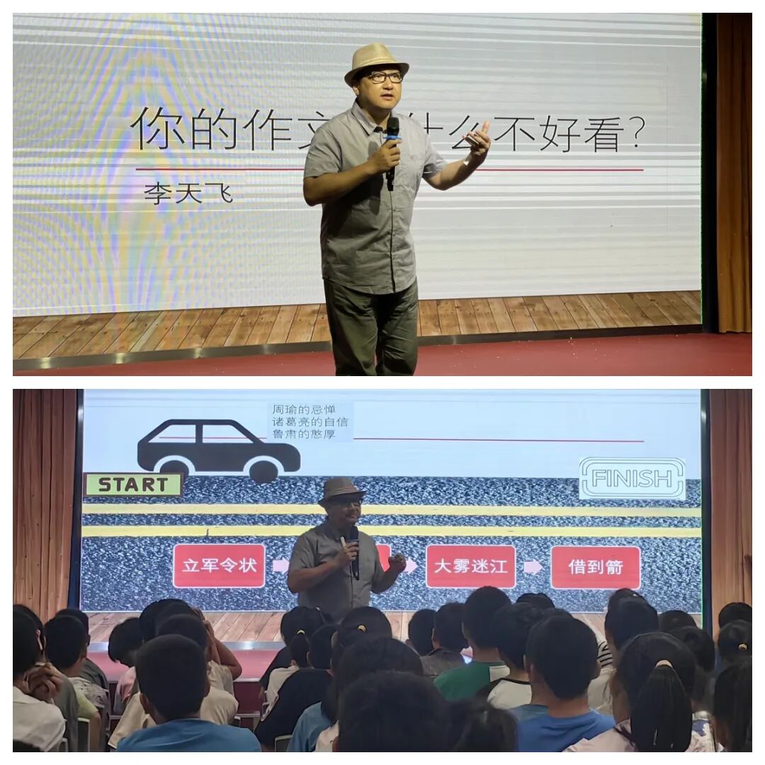 展演结束后,李老师以富有启发的课题“你的作文为什么不好看”为引,运用一系列生动鲜活的图片,巧妙地借用了四大名著中脍炙人口的经典故事,为学生们带来了一场别开生面的写作指导。李老师将写作过程形象地比作自驾游,既生动又直观。“去哪里玩”代表故事的主线,如同旅行的目的地;“开什么车”则是故事的动力,如同驱动我们前行的引擎;而“中间有哪几站”则是故事的节奏,如同旅行途中的风景与驿站。这样的比喻,让同学们对写作有了更为直观的理解。在指导过程中,李老师不仅为学生们揭示了写作的基本框架,还鼓励他们从自尊、友情、亲情、报恩、怜悯等多个角度挖掘故事的动力,拓宽了他们的思维视野。
