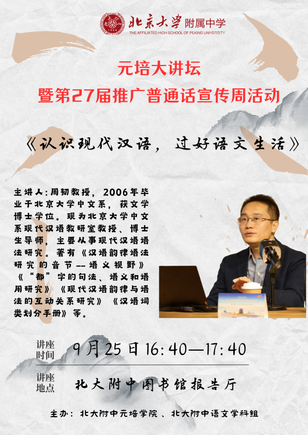 北京大学附属中学邀请北京大学中文系现代汉语教研室周韧教授以《认识现代汉语,过好语文生活》为题开展讲座,周教授计划从普通话的定义、如何使用普通话、普通话与我们的生活等角度,为同学们传道授业。