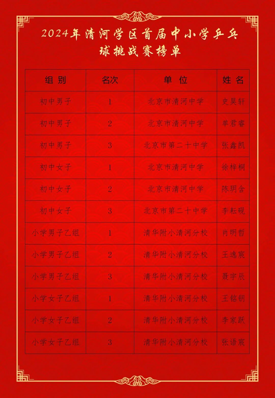 11月2日,2024年清河学区首届“清禾杯”中小学乒乓球挑战赛圆满收官。此次挑战赛吸引了来自北京市第二十中学、北京市清河中学和清华大学附属小学清河分校等学校的众多乒乓球爱好者踊跃参与,他们在赛场上激烈角逐,尽显清河少年顽强的拼搏精神。