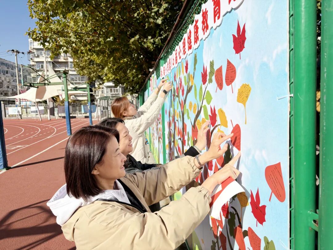 在活动中,老师和学生们纷纷拿起笔,在一片片形状各异、颜色丰富的秋叶上,书写下对伙伴的赞美、美好回忆以及在交往过程中认为最重要和值得注意的事情。这些话语有的真挚感人,有的幽默风趣,每一片叶子都承载着师生们深深的情感与真挚的友谊。当这些秋叶被贴在操场上的大树展板上,形成了一面充满爱与温暖的“心语墙”时,整个校园都弥漫着一种温馨而和谐的氛围。学生们驻足观赏,相互分享,不仅加深了对彼此的了解和信任,还激发了更多的正面情感与积极能量。
