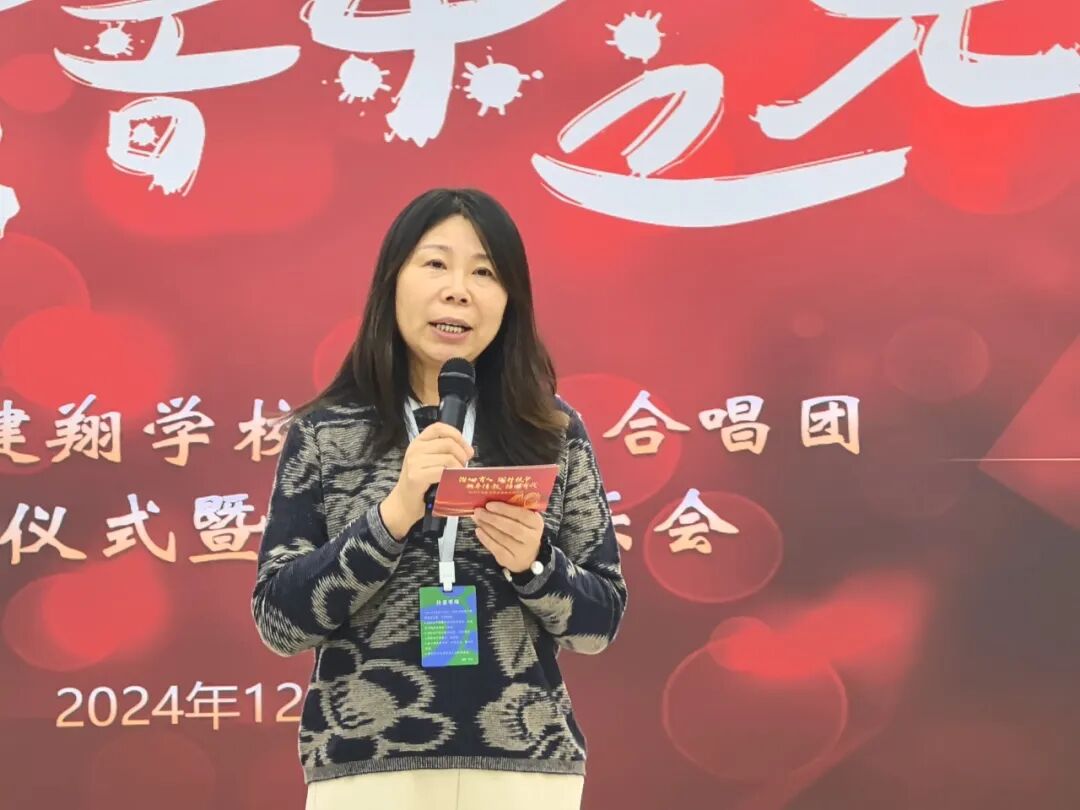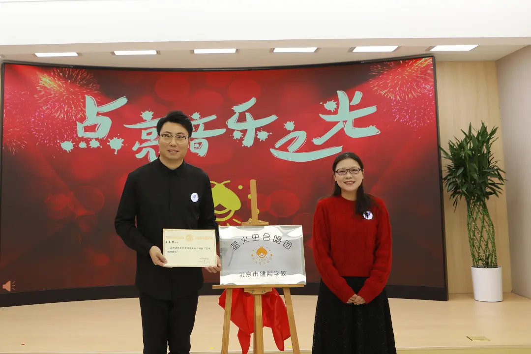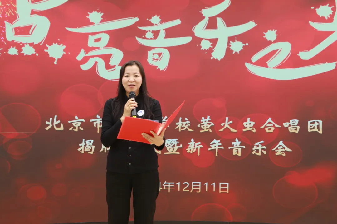 张继兵副校长介绍了合唱团的发展历程。北京市健翔学校合唱团坚持以“美育润心、艺术启智”为发展目标,萤火虫合唱团团名及标识设计体现了“萤火虽微·愿为其芒”的精神,温暖笑脸即是萤火虫的发光体,蕴含着合唱团精神:我们愿用微光带给世界温暖和欢乐。一路走来合唱团的学生们不仅用歌声传递了爱与美好,更是唱出了内心的自信与坚强,未来,希望合唱团秉持新的使命,继续前行。
