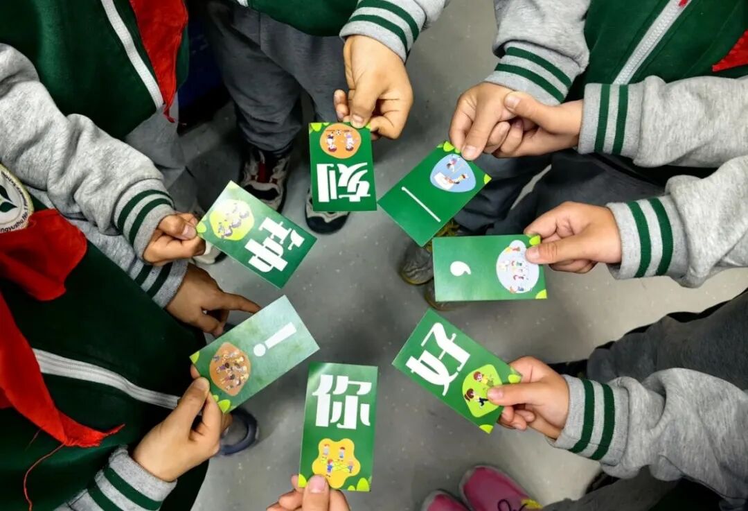 “东南西北”游戏大变身,快看,孩子们正在跟着英文版“东南西北”读单词,唱歌谣。