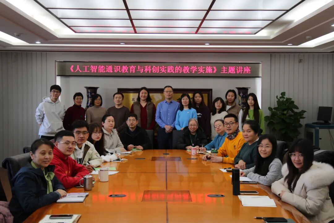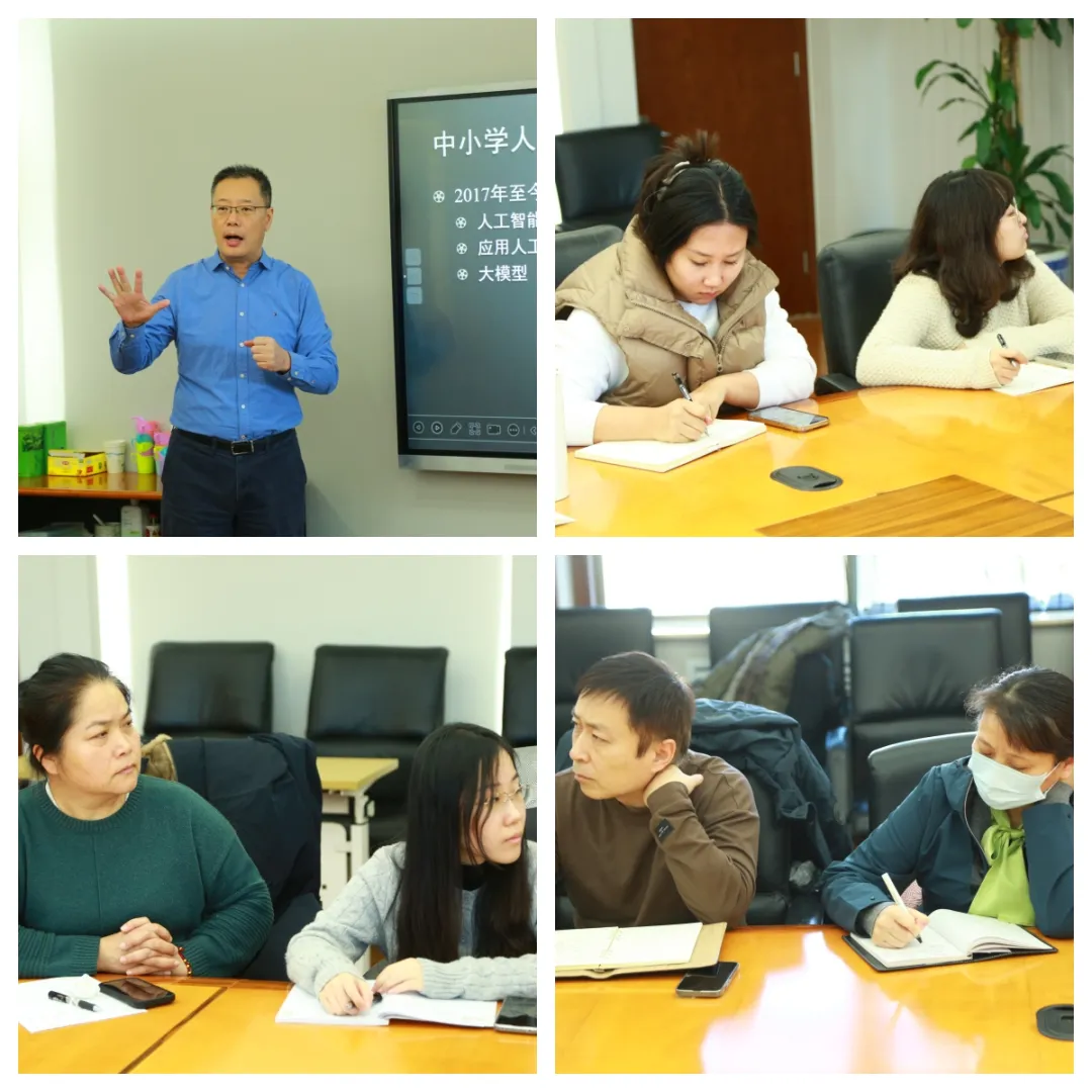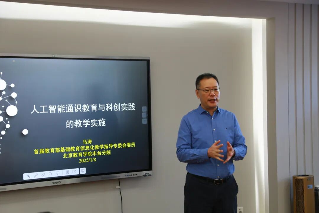 为推动学区内人工智能教育发展,助力教师掌握前沿教学理念与方法,万寿路学区于 2025年1月8日举办了小学科学学科基地专题研修活动。本次活动由学科基地首席陈颖老师主持,邀请了北京教育学院丰台分院副院长马涛老师做《人工智能通识教育与科创实践的教学实施》主题讲座,万寿路学区左卫东副主任及基地各校科学教师,部分学校信息技术学科教师共同参加了活动。