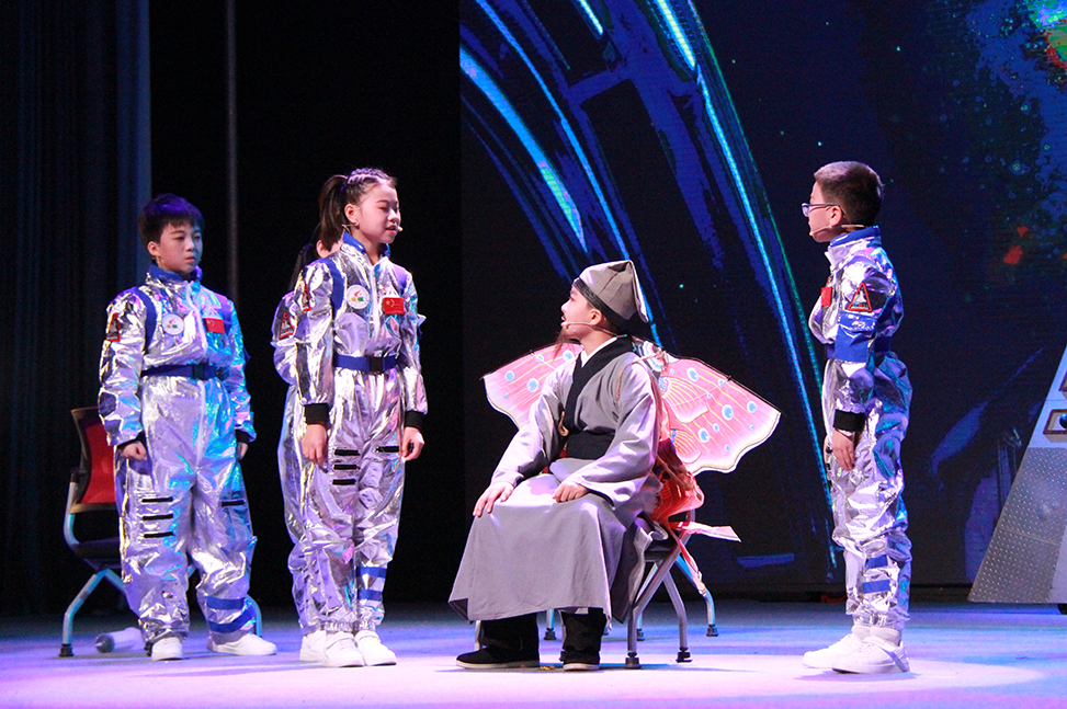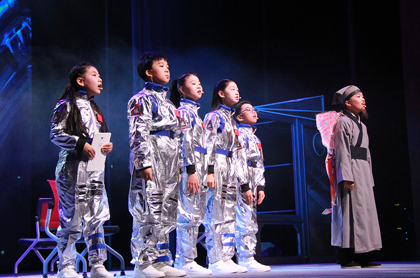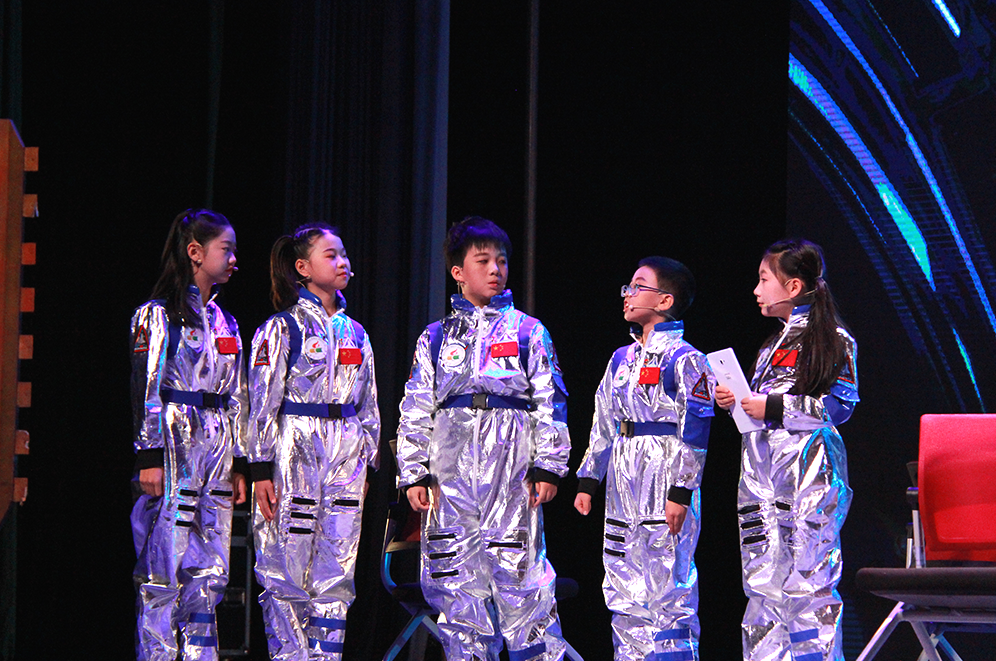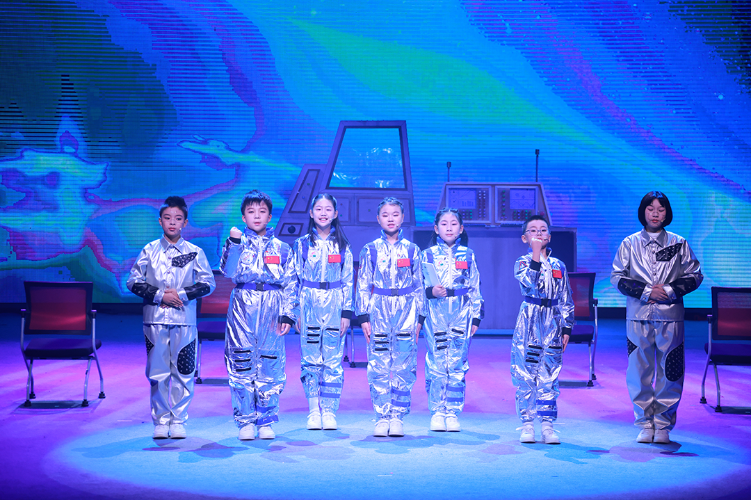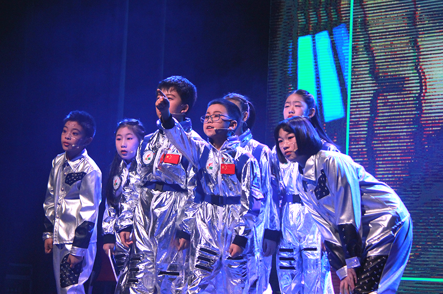 五年级8班 刘昱辰:我这次饰演的是双子星一号。在这次排练演出的过程中,我经历过因为觉得排练辛苦和身体不适想要退出的不坚定,但是老师们一直对我们悉心和耐心地指导,每个同学们也都不怕困难一起坚持到底,让我感受到了集体活动中团结的力量,我很荣幸能够参与本次演出,希望我们祖国的航天事业越来越强。