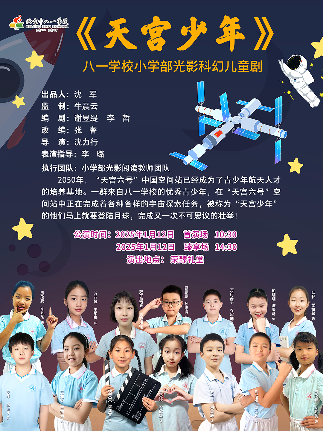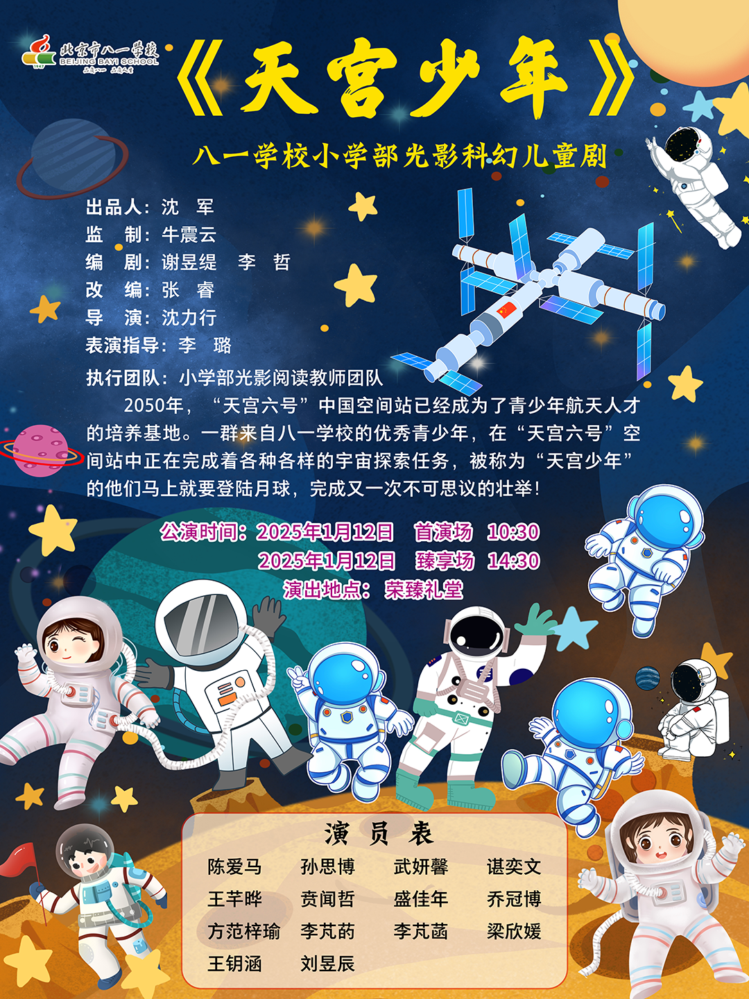 航天科技教育,作为八一学校的特色,引领无数学子走进航天世界,探索科技奥秘。为达成建设世界一流科技高中的长远目标,学校通过丰富的航天科普课程、先进的实验室设施和参与国家级航天项目,打造了独特的航天科技教育体系。2025年1月12日,由北京市八一学校隆重推出的原创科幻儿童剧《天宫少年》在荣臻礼堂震撼上演。这部作品不仅将观众带入了一个充满未来感的空间站世界,还通过幽默诙谐的情节和深刻的主题思想,展现了孩子们的成长与团队协作精神,赢得了现场观众的一致好评。下面,让我们一起了解一下吧!