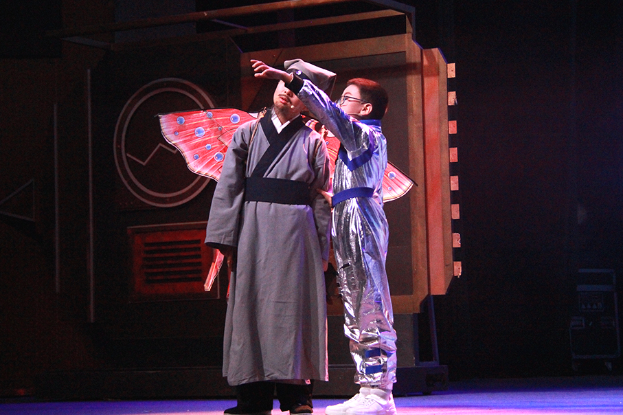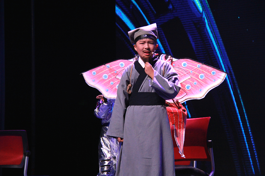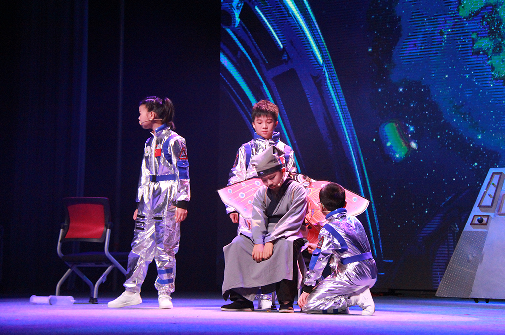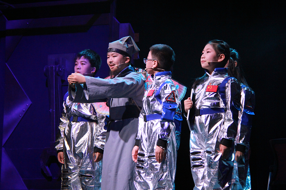 五年级3班 方范梓瑜:我在这部剧里饰演双子星2号。能够参加这次的演出我觉得非常兴奋,也体会到了一个话剧演员的辛苦和不易。这部话剧充满了对太空的想象和向往,我印象最深刻的就是万户先生为了登月成功不怕危险和牺牲的精神。