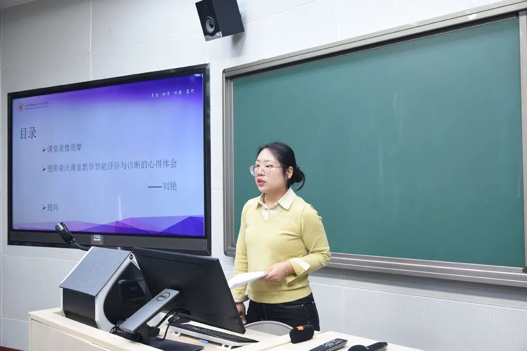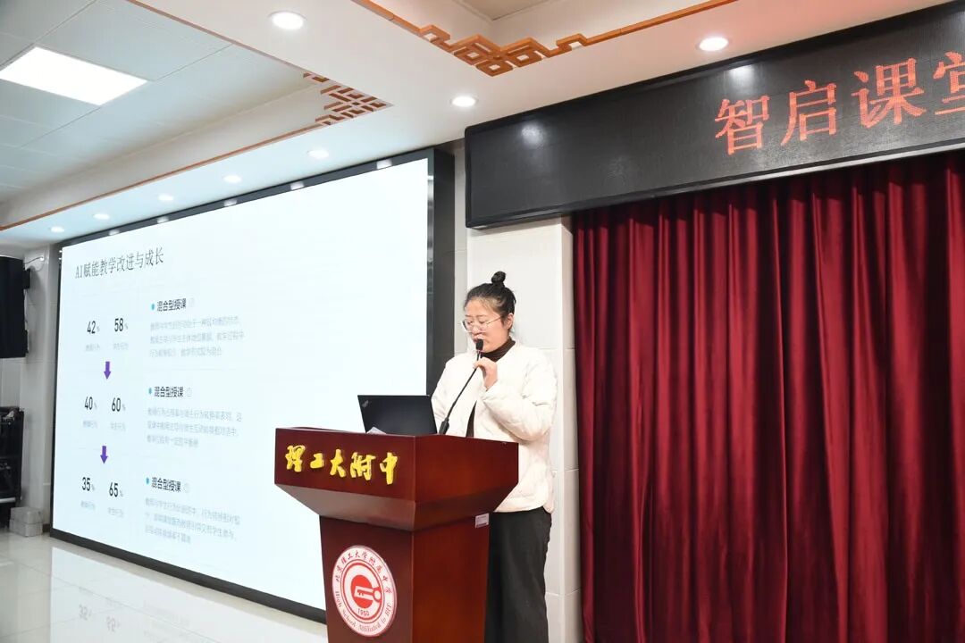 观摩课后,文理科教师分别进行教学经验分享。文科场刘伟睿老师分享了备课和上课过程中与AI“博弈到共舞”的历程,讲述AI如何辅助她优化教学设计、调整教学节奏。在智能辅助教学工具领域,刘伟睿老师分享了希沃白板、豆包、deepseek等软件的使用方法。希沃白板能展示汉字笔画、组织课堂活动、梳理知识结构;AI智能体可模拟角色对话、充当辩论陪练;文生图与文生音乐能将文字转化为图像、旋律,辅助教学。在个性化教学与诊断方面,刘伟睿老师借助希沃录课,结合多种分析模型,从教师提问、候答时间,到师生互动风格、学生学习行为分布等多维度评估教学,为教师优化教学提供思路。