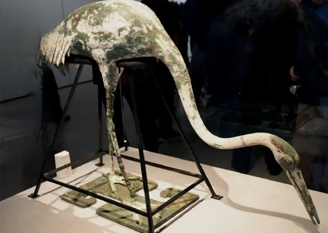 和图片不同的是,青铜仙鹤的实物更加细腻和逼真,展现了其灵动的质感,仿佛让我们看到了高挑的仙鹤抓虫子的场景。坚硬的青铜材质,竟能体现出根根分明的羽毛和仙鹤动态的美感。其精湛的青铜制作工艺,让同学们大为赞叹。