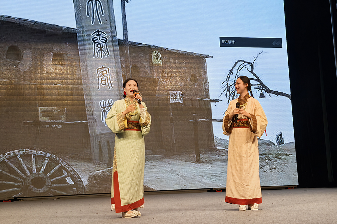 看过了馆藏文物,同学们被秦文化的磅礴大气深深震撼,而生活化的历史同样是动人的。王杨雪和朱丹两位老师,穿着秦服翩翩入场。她们身上的玉佩,发出叮叮当当的响声,清脆悦耳。一时间,《诗经》中“绿衣黄裳”得以具象化。
