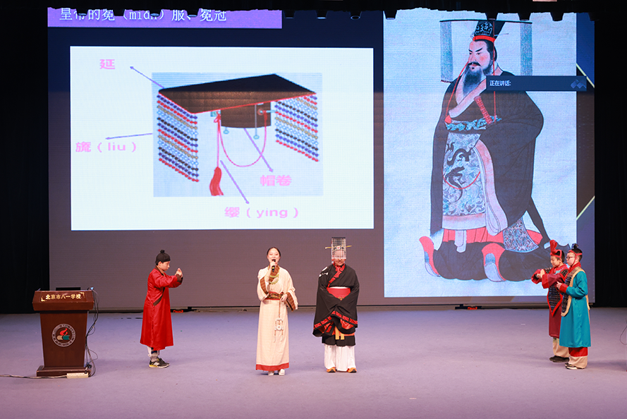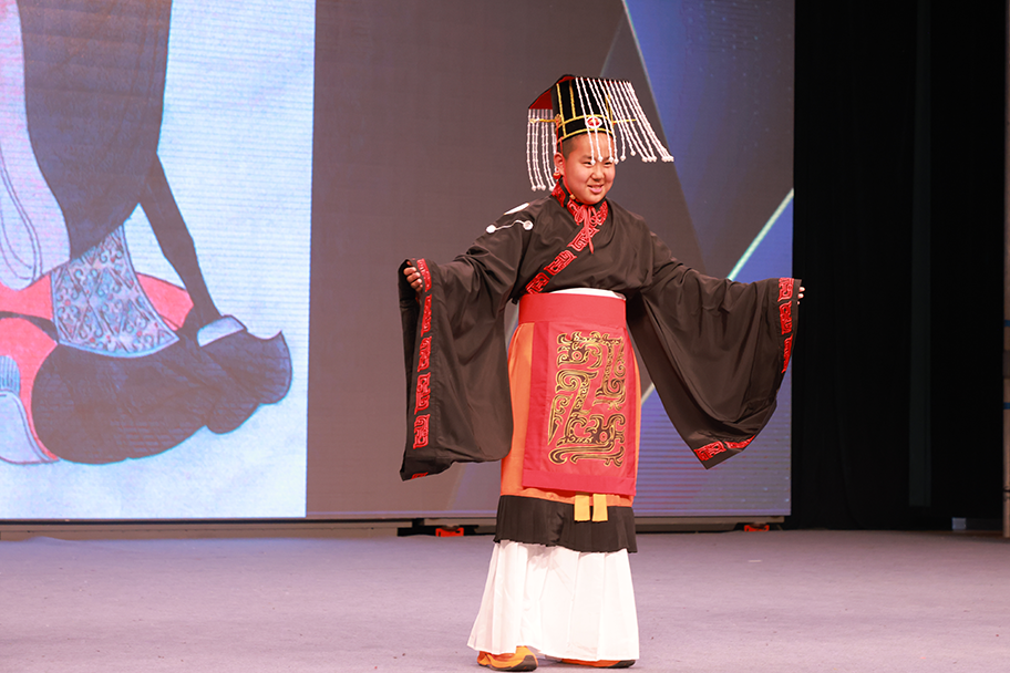 秦朝服饰发布会上,进行服装展示的同学,是来自预备年级的志愿者。讲解老师为同学们排练了一部服饰穿越剧,四位同学分别扮演了立式俑、中级官吏俑和高级官吏俑。