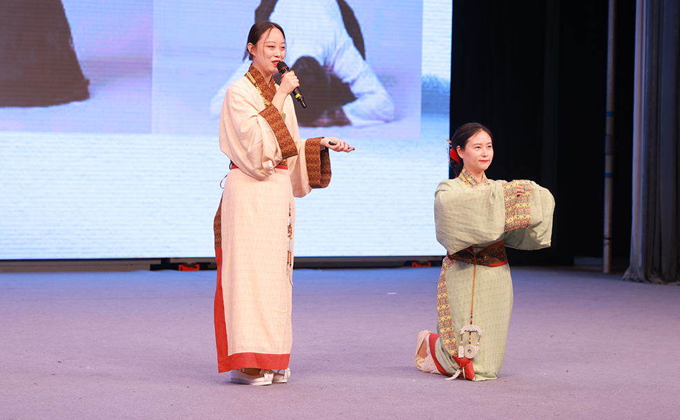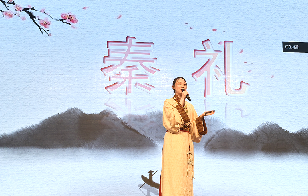 接下来,两位老师穿着秦服,向同学们演示秦礼。她们从礼仪的场景、方式等方面,讲解了礼仪的精神内核。这种服饰与礼仪的完美配合,让同学们直观体会到古代如何通过衣着塑造礼制,在礼仪中蕴含的对秩序与和谐的追求,以及对天地人的敬畏。