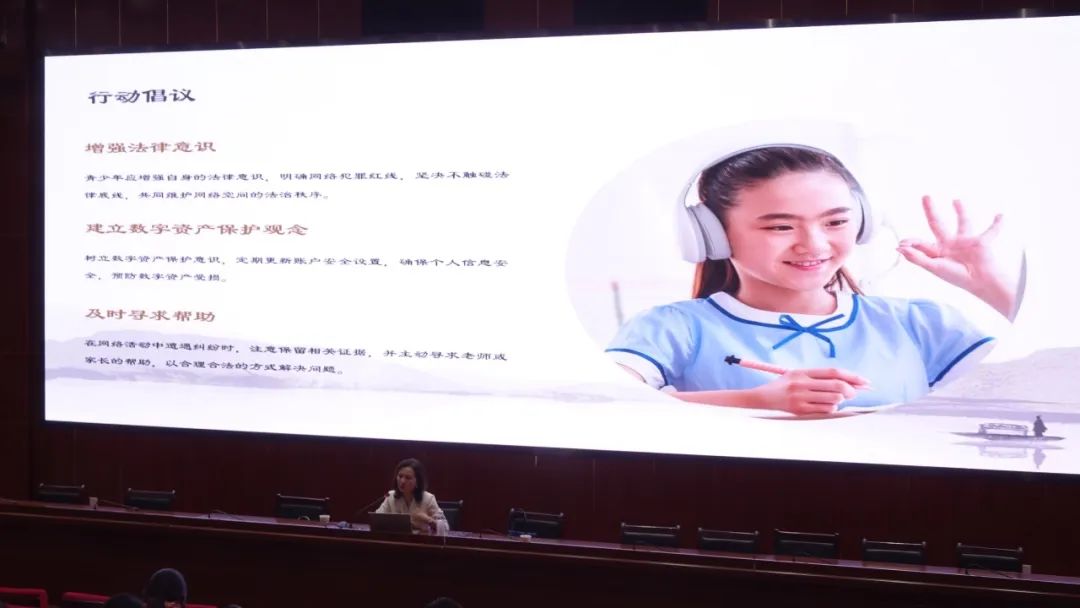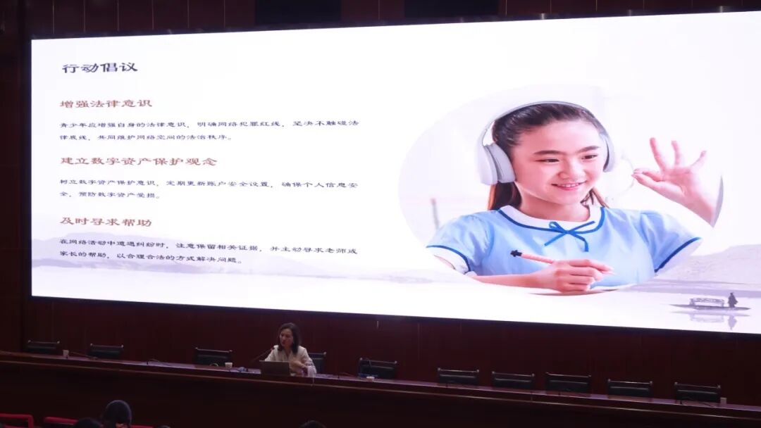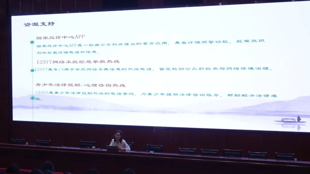 讲座尾声,王静律师向全体同学发出倡议:增强法律意识,树立数字资产保护观念,遭遇网络纠纷时及时寻求帮助。她还推荐了国家反诈中心APP、12377网络不良信息举报热线等实用工具,鼓励大家积极参与网络环境治理。